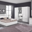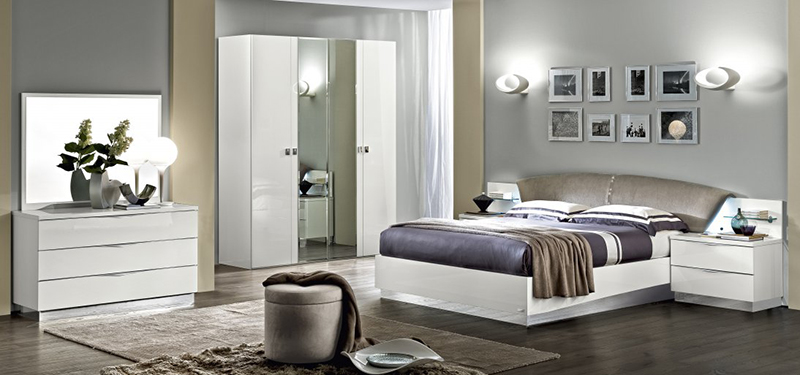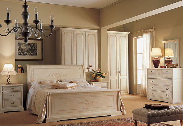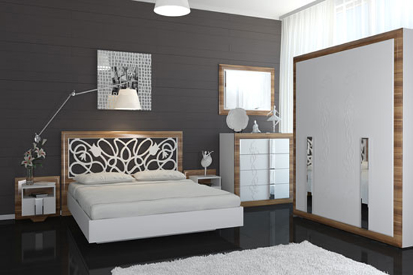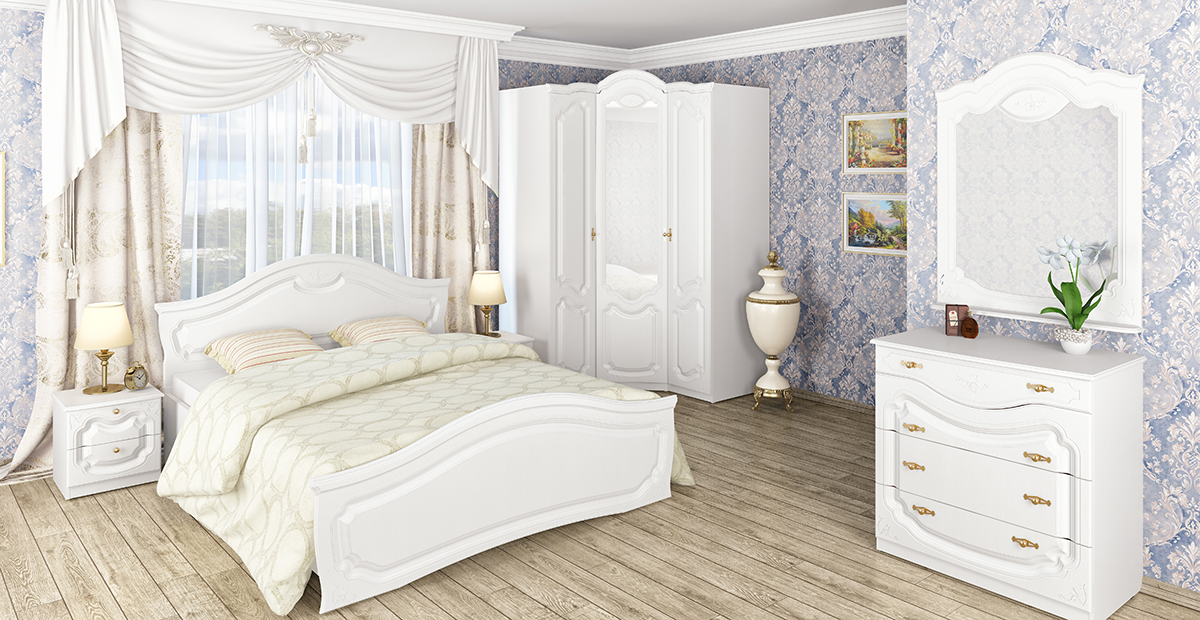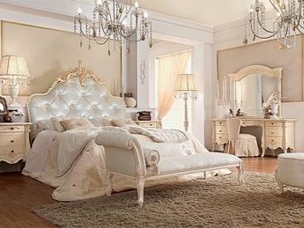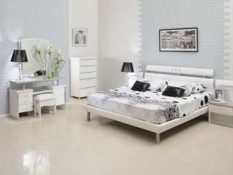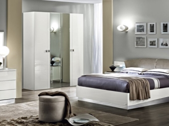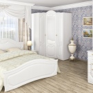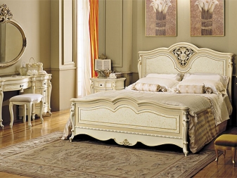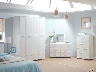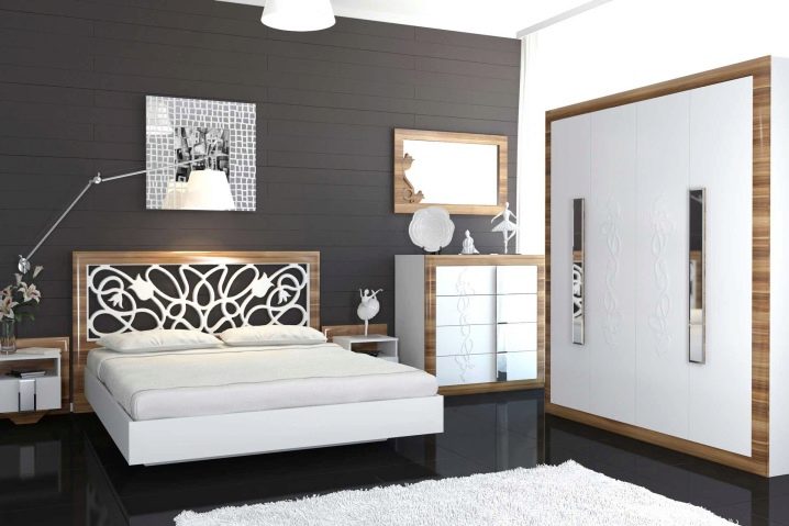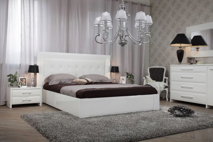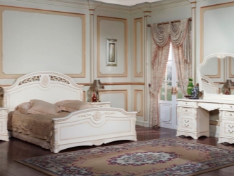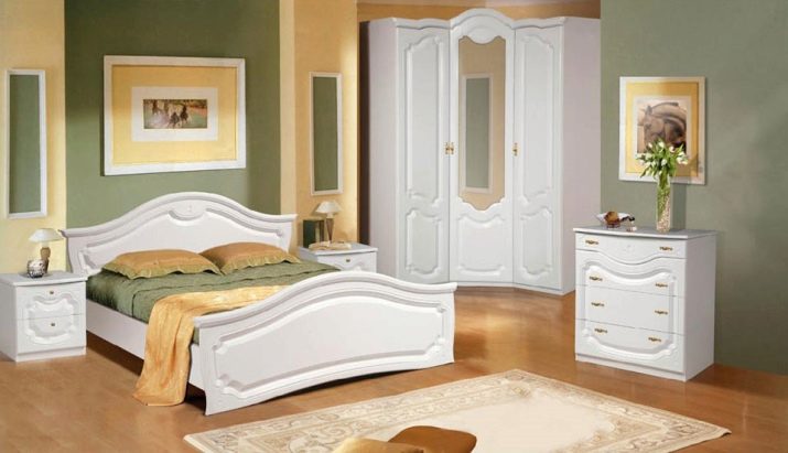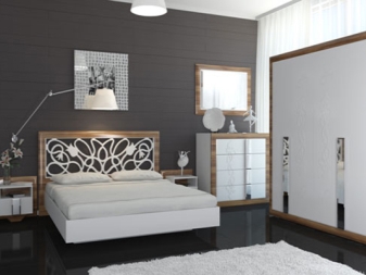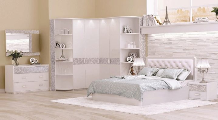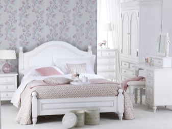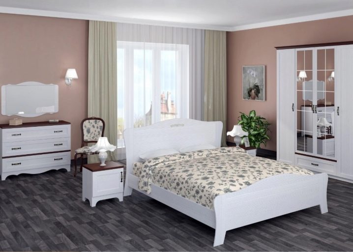Weiße Schlafzimmermöbel müssen nicht mit Schattierungen getönt werden. Das Farbschema kann in beigen und sogar dunkleren Farben variieren. Das Möbelset enthält in der Regel folgende Artikel: