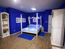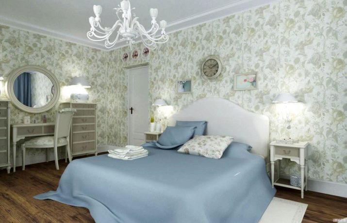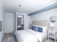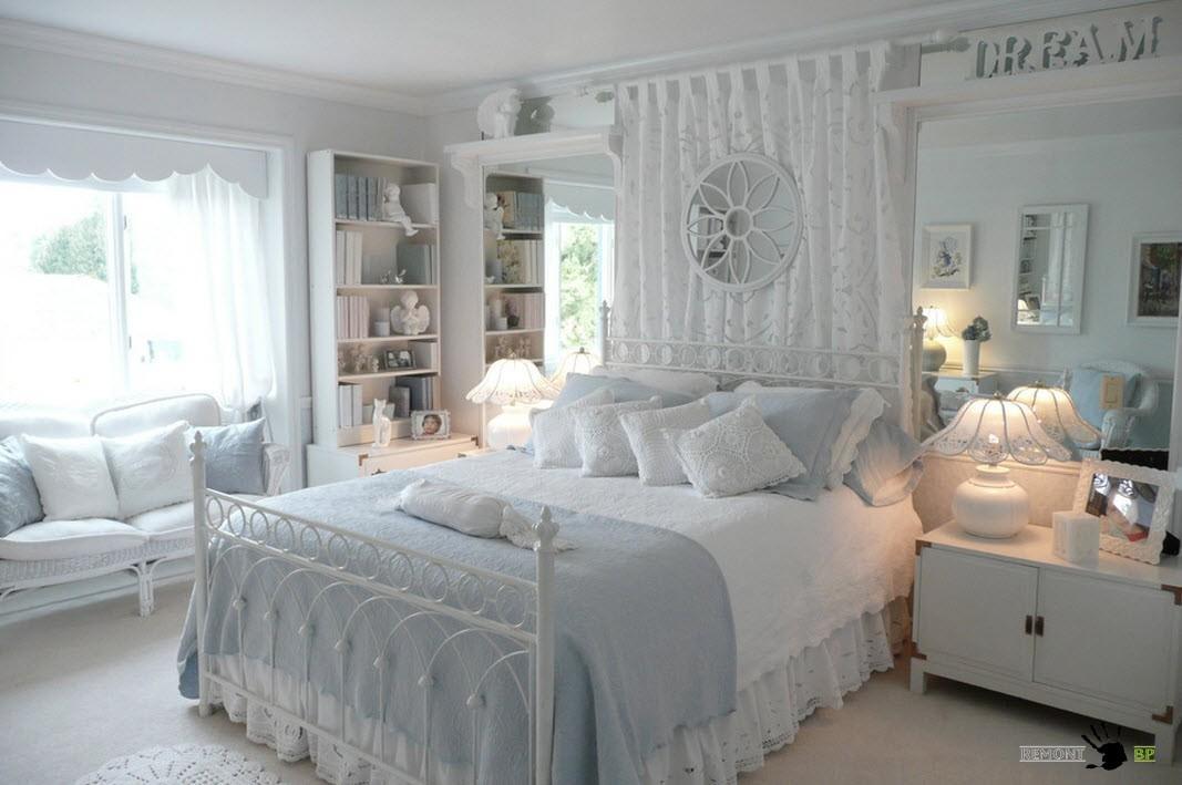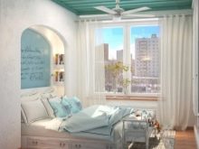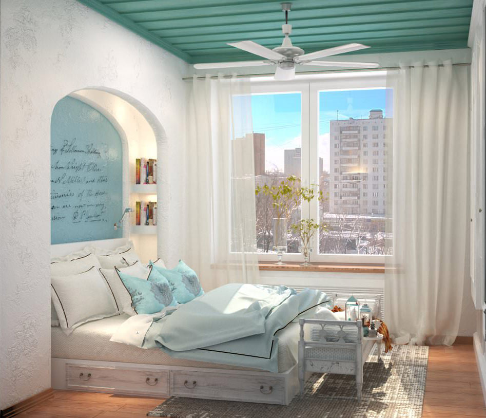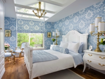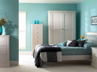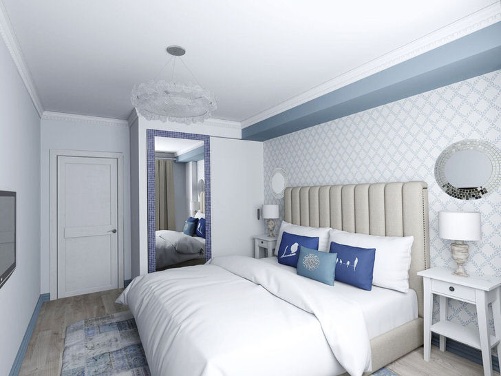 - Eine übliche Wahl ist ein Raum mit blauen Wänden und einer hellen Decke. Ein solcher Raum als wäre er mit Luft gefüllt.Damit weiße Möbel nicht langweilig aussehen, sollten Sie eine Tagesdecke kaufen, die sich farblich an die Wände anpasst. Sie können die Kissen leicht belassen und eine Vase oder ein anderes himmlisches Zubehör auf den Nachttisch oder Frisiertisch stellen. Wenn der Sitz es Ihnen ermöglicht, Stühle oder Sessel zu installieren, achten Sie darauf, einen azurblauen Schirm in der Polsterung zu verwenden.