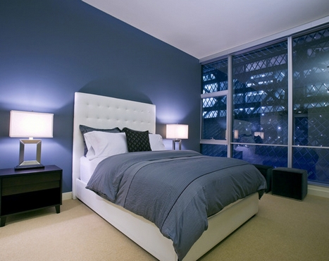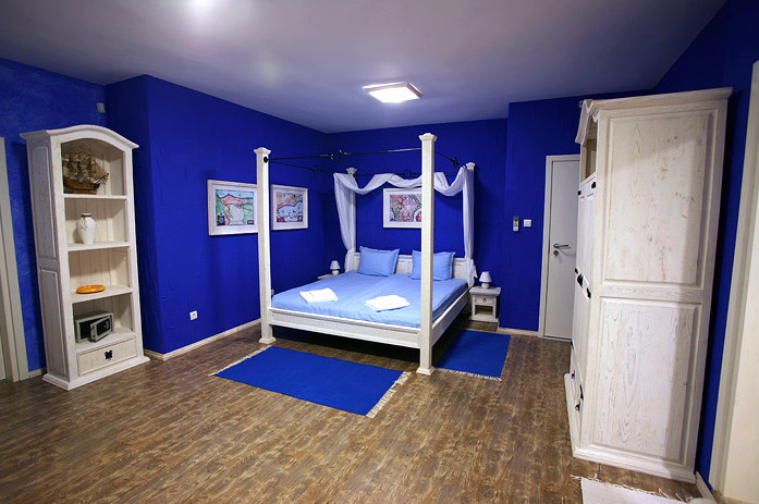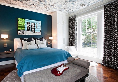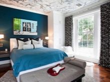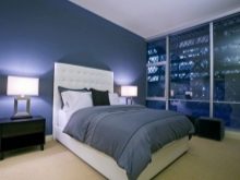 - Eine ziemlich kühne Entscheidung ist es, einen kräftigen Blauton im Design des Bettes zu verwenden. Mit weißen Möbeln harmoniert die Blautönung der Wände und Decken perfekt, eine wichtige Voraussetzung ist jedoch eine gute Raumbeleuchtung. In einigen Fällen wird das allgemeine Aussehen mit roten Accessoires verziert: Dekorative Kissen, Gemälde oder Figuren werden den kalten Bereich ideal abschwächen. Mit der Verwendung von blauer Farbe, sind britische Design-Lösungen beliebt.