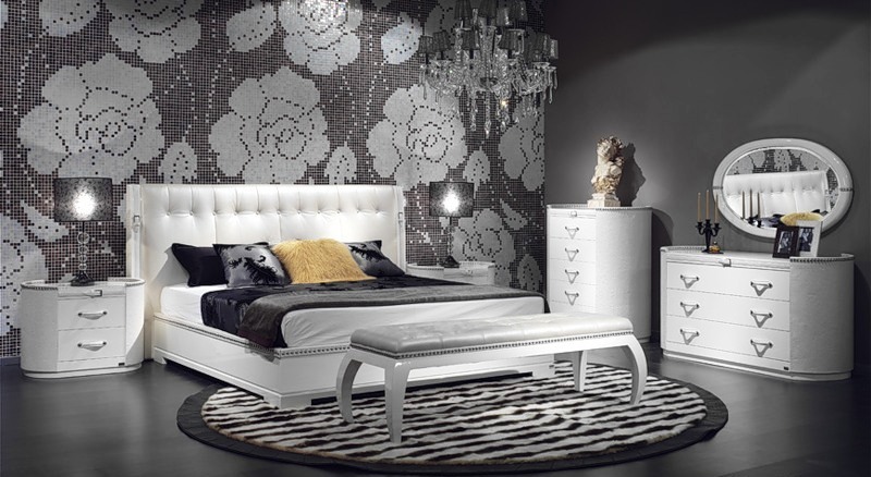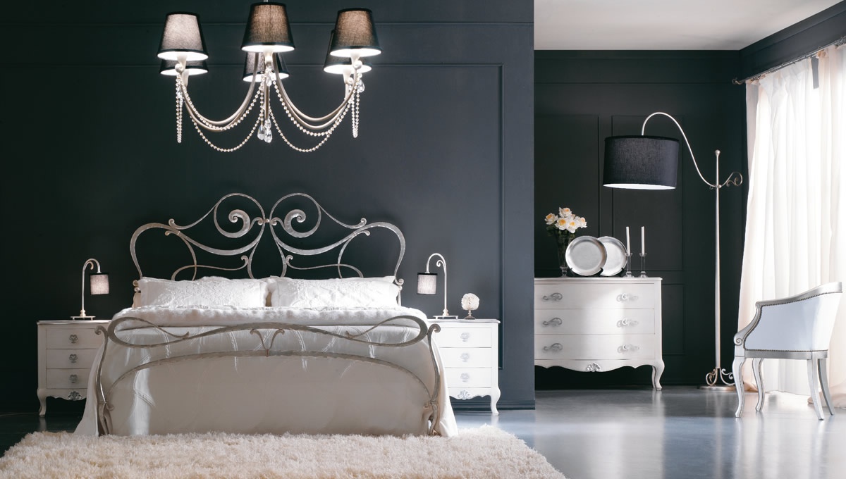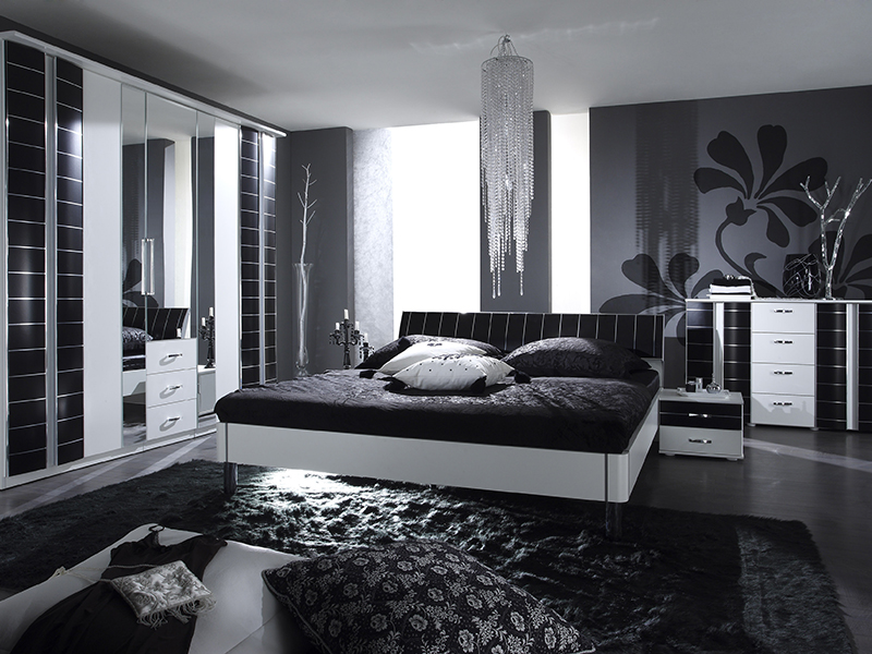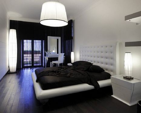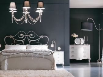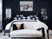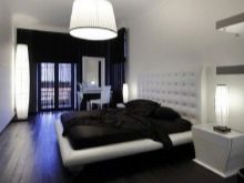 - Wer das Spiel der Kontraste liebt, mag die kühne Kombination aus schwarzen und weißen Farben. In solchen Schlafzimmern ist es nicht notwendig, dass alle Möbel weiß sind. Genug, um einen leichten Akzent auf dem Bett zu hinterlassen, können Nachttische und Headsets 2 Töne kombinieren. Dunkle Organza Vorhänge sind akzeptabel, aber wenn Sie Vorhangstoffe bevorzugen, sollten sie mit weißem Tüll verdünnt werden. Die Wände können in hellen Farben dekoriert werden, und Sie können mit schwarz-weißen Ornament experimentieren.