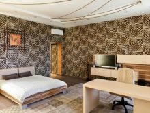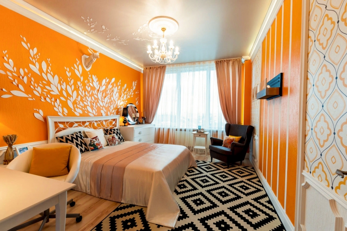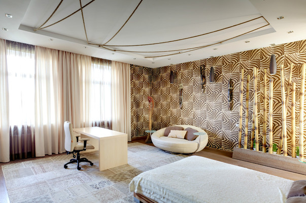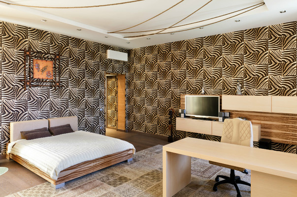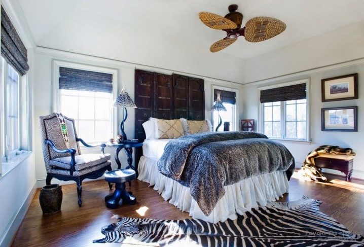 Nachahmung von Tierhäuten ist akzeptabel, wenn das Interieur im afrikanischen Stil dekoriert ist. Die Gemeinsamkeit des Designs des Teppichs mit einem Schleier auf dem Bett ist relevant.