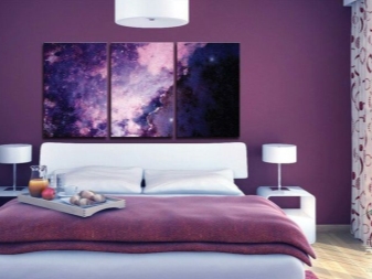 - Lila oder lila Schlafzimmer kann nicht besser mit weißen Möbeln kombiniert werden. In einem solchen Design erlaubt Kochton. Auf dem Bett wird eine erstaunliche zweifarbige Tagesdecke und lila oder sogar lila Kissen aussehen. Die Wände in einem solchen Raum sind in der Regel nicht eintönig, also entscheiden Sie sich für ein Ornament. Schränke und Regale können in einer gedämpften lila Farbe hergestellt werden, um übermäßige Helligkeit zu vermeiden.