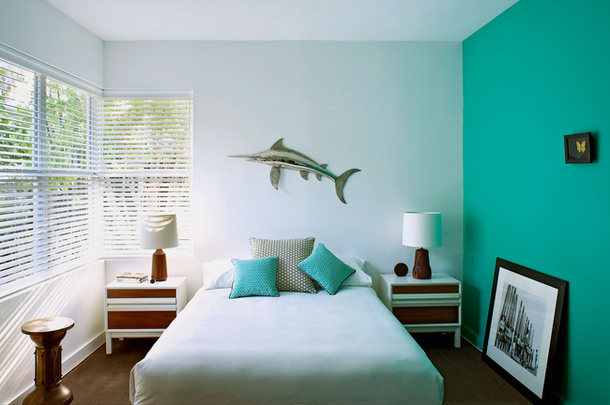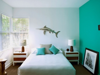 - Fans von weniger kalten Farben passen Türkis. Er ist sehr saftig und gleichzeitig ziemlich ruhig. Grundsätzlich ist diese Farbe gut für die Gestaltung von Lampen, Vorhängen, einzelnen Wandteilen. Helle Möbel mit hellen Kissen sind die beste Ergänzung zu den Marine-Bereich. Auf Wunsch können Sie das Interieur mit edlen Brauntönen in Textilien verdünnen.