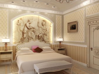 Wenn die Decke im Raum niedrig ist, ist es nicht empfehlenswert, sie in hellen Farben zu machen. Ein schneeweißer Ton wird die Decke optisch höher machen. Dies trägt auch zur vertikalen Verzierung an den Wänden bei. Horizontal, im Gegenteil, erweitern optisch den Raum des Schlafzimmers.