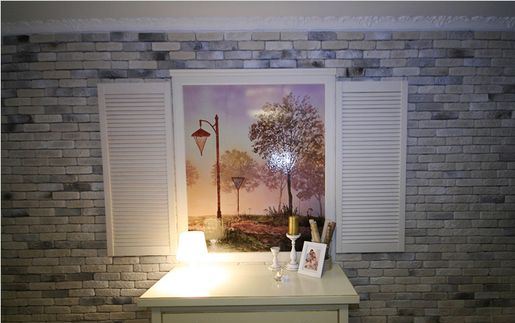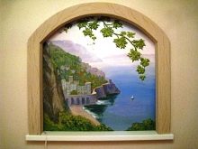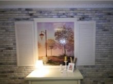 Eine kompliziertere Option ist die Installation eines vollständigen Fensters. Das einzige, was es vom Üblichen unterscheidet - die Künstlichkeit der Landschaft. Für die Installation benötigen Sie einen massiven Holzrahmen mit Fensterläden und Glas. Hinter ihm können Sie die gleichen Bilder reparieren. Ein solches Fenster lässt sich leicht mit Vorhängen oder Tüll drapieren und für den jeweiligen Stil in Ihrem Raum auswählen.