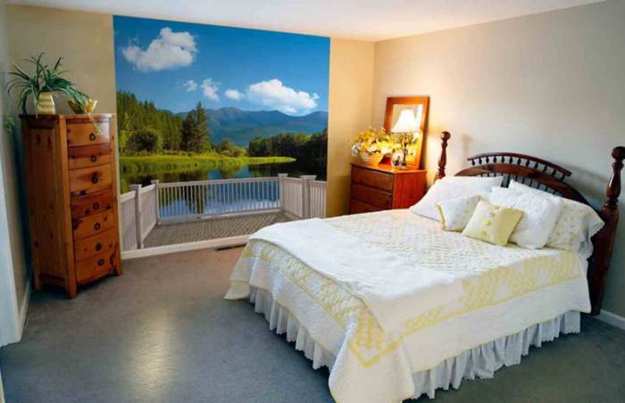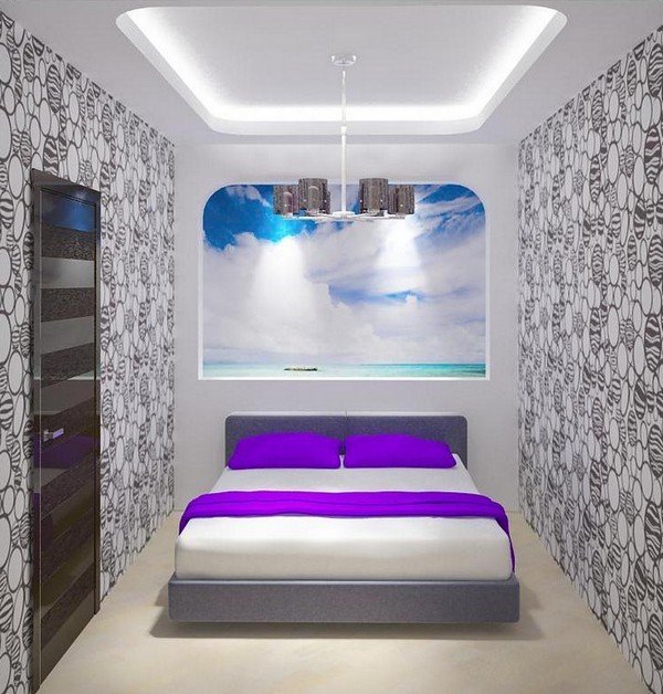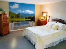 Wenn im Schlafzimmer überhaupt keine Fenster vorhanden sind, können Sie versuchen, ein sogenanntes Scheinfenster im Raum zu installieren. Sie können diesen interessanten Trick auf mehrere Arten gleichzeitig durchführen. Am einfachsten ist es, ein einfaches Bild eines Fensters an eine Wand zu kleben. Jetzt können solche Plakate in fast jedem Geschäft gekauft oder online bestellt werden.Sie können ein beliebiges Bild wählen, einen Blick auf den Eiffelturm oder eine Berglandschaft werfen.