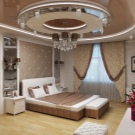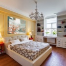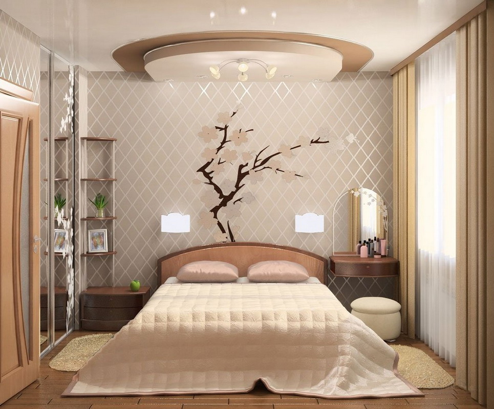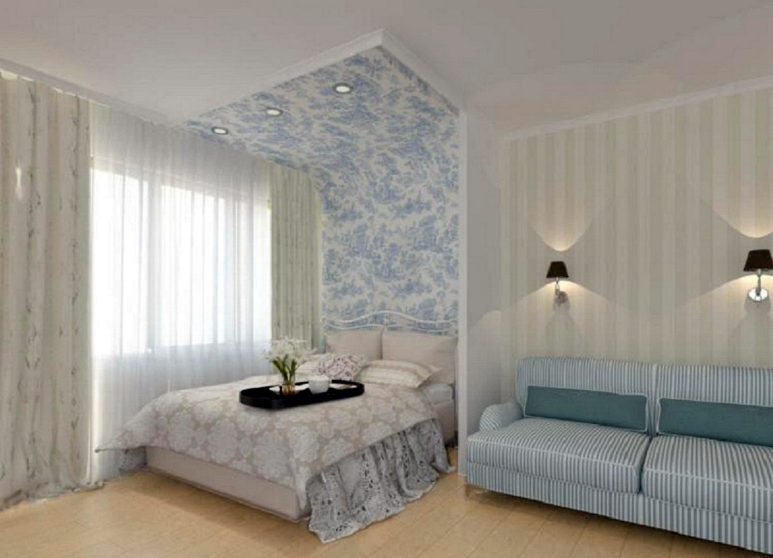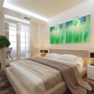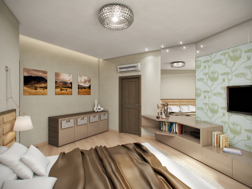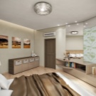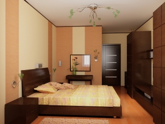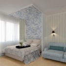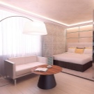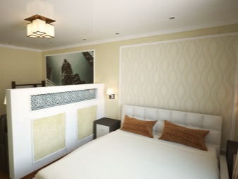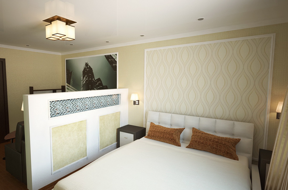 Die zweite Option ist einfacher - am Eingang des Zimmers ist ein Wohnbereich angeordnet, der durch eine leichte Trennwand, Regale und Pflanzen vom Schlafzimmer getrennt ist.Es sollte bedacht werden, dass das Wohnzimmer und das Schlafzimmer miteinander kombiniert werden sollten: ein einziges Farbschema, Ornamente, Bodenbeläge. Eine bewusste Zuweisung einer Zone zur Betonung der Aufmerksamkeit ist erlaubt, so dass es möglich wird, den Raum einer Schlafzone in den Schatten zu verschieben.