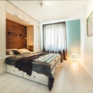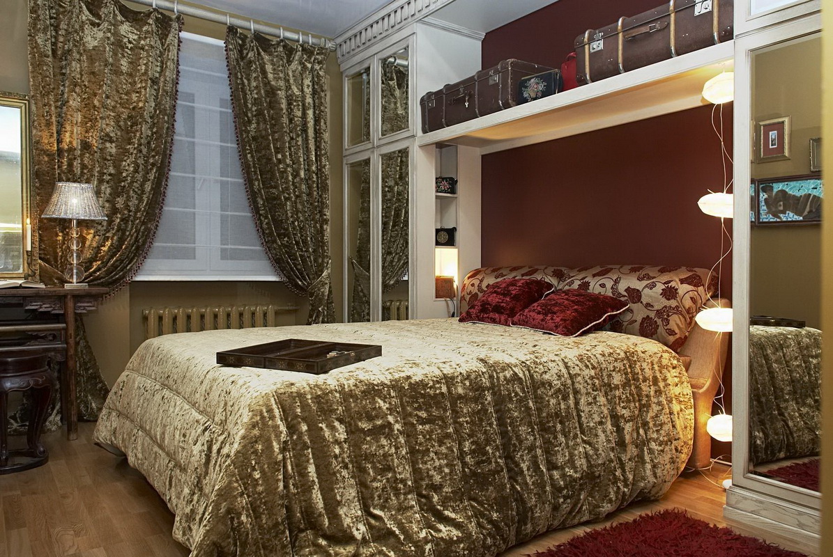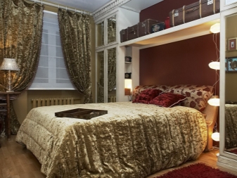 Die Menge der Polstermöbel ist auch am besten minimiert, bevorzugen leichte Hocker und Sofas, lichtdurchlässige Stühle. Platzeinsparung ermöglicht die Ablehnung der üblichen Möbelstücke und die Ersetzung durch alternative. Zum Beispiel können Klappregale Nachttische ersetzen. Eine Kommode kann durch ein Bett mit Schubladen ersetzt werden. Der Frisiertisch wird perfekt in einen großen Spiegel im Boden- und Klapplagerungssystem verwandelt.
