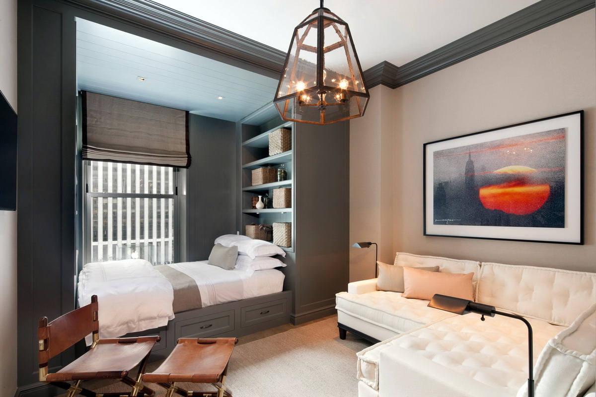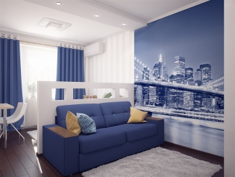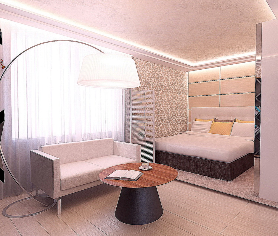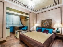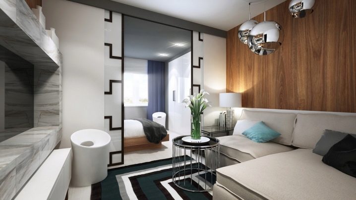 Wenn das Apartment ein Studio ist oder es keine Möglichkeit gibt, ein separates Zimmer für das Schlafzimmer zu reservieren, können Sie das Wohnzimmer und das Schlafzimmer kombinieren. Es ist notwendig, klar zwischen Gast und persönlichen Bereich zu unterscheiden. Natürlich, wenn der Raum groß ist, wird es einfacher sein. Bei kleinen Zimmern können Sie auf multifunktionale Möbel zurückgreifen. Zum Beispiel wird ein einzelnes System, das einen Kleiderschrank, ein Sofa, ein Klappbett und einen Schreibtisch umfasst, nur eine Wand im Raum einnehmen, aber es wird viele Funktionen geben. Aber eine solche Lösung ist eher für Liebhaber des Minimalismus geeignet und sollte darauf vorbereitet sein, dass jeder Tag eine Reihe von Aktionen durchführen muss, um das Schlafzimmer in ein Wohnzimmer und zurück zu verwandeln.
