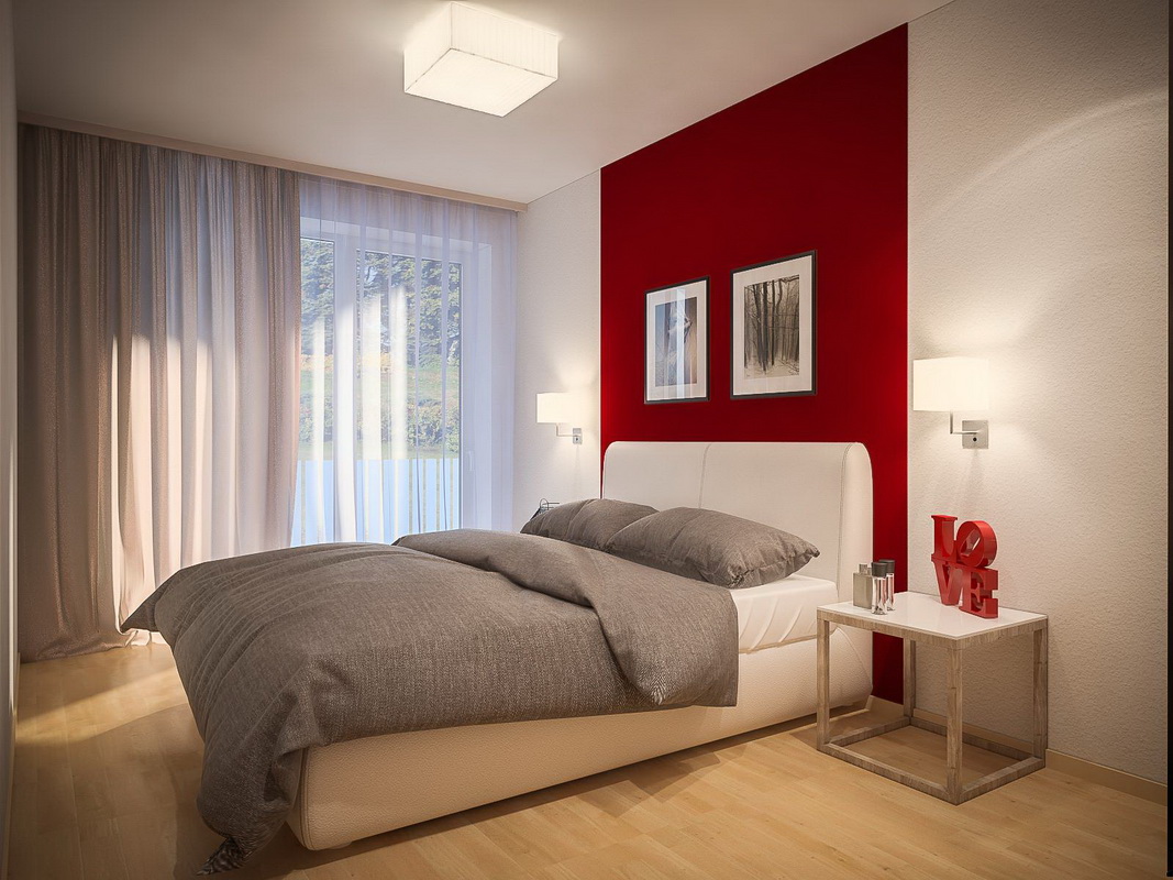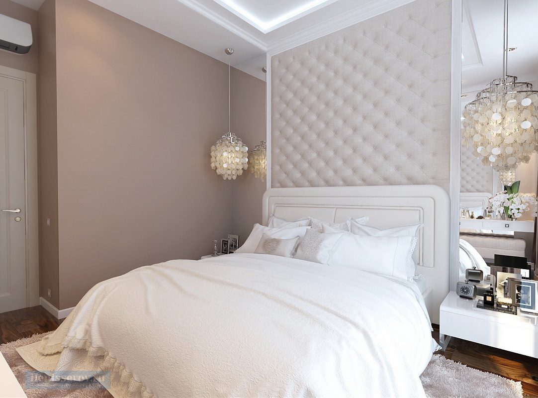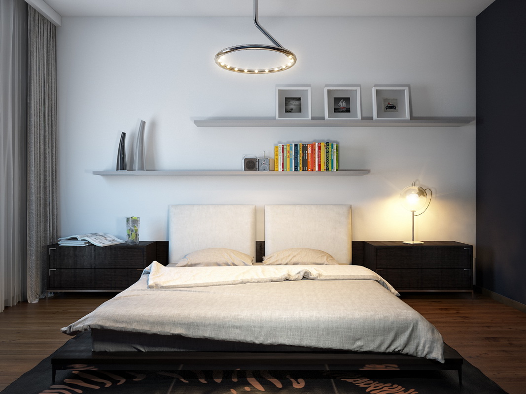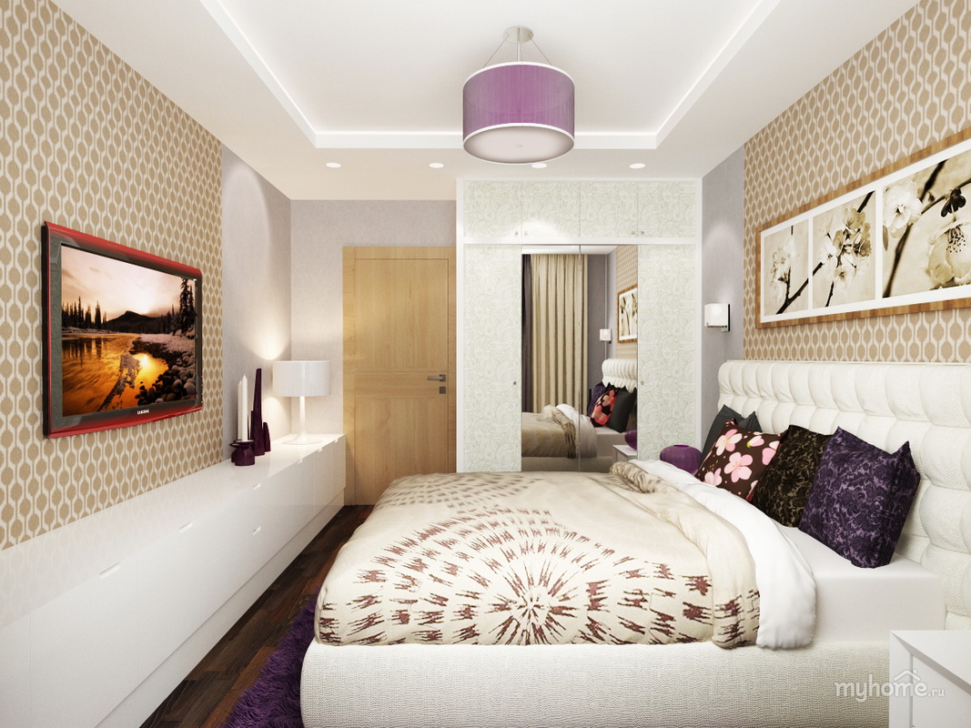 In einem langen und schmalen rechteckigen Raum ist es besser, ein Bett senkrecht zu einer langen Wand zu haben, wodurch ein Rhythmus entsteht und das Gefühl der Monotonie des Raums verschwindet. Aber der quadratische Raum ist in Bezug auf die Möbelplatzierung am vorteilhaftesten, da die Proportionen des Raumes anfangs korrekt sind. Es ist besser, das Bett mit dem Kopfteil gegen die Wand zu stellen, den Schrank in der dunkelsten Ecke zu entfernen und den leichtesten Raum mit einem Sessel und einem kleinen Tisch an den Ruhebereich anzupassen.Es ist wichtig, dass das Bett nicht sichtbar war oder nicht vollständig sichtbar war, wenn die Tür zum Zimmer offen ist, so dass Komfort und Gemütlichkeit zunehmen.