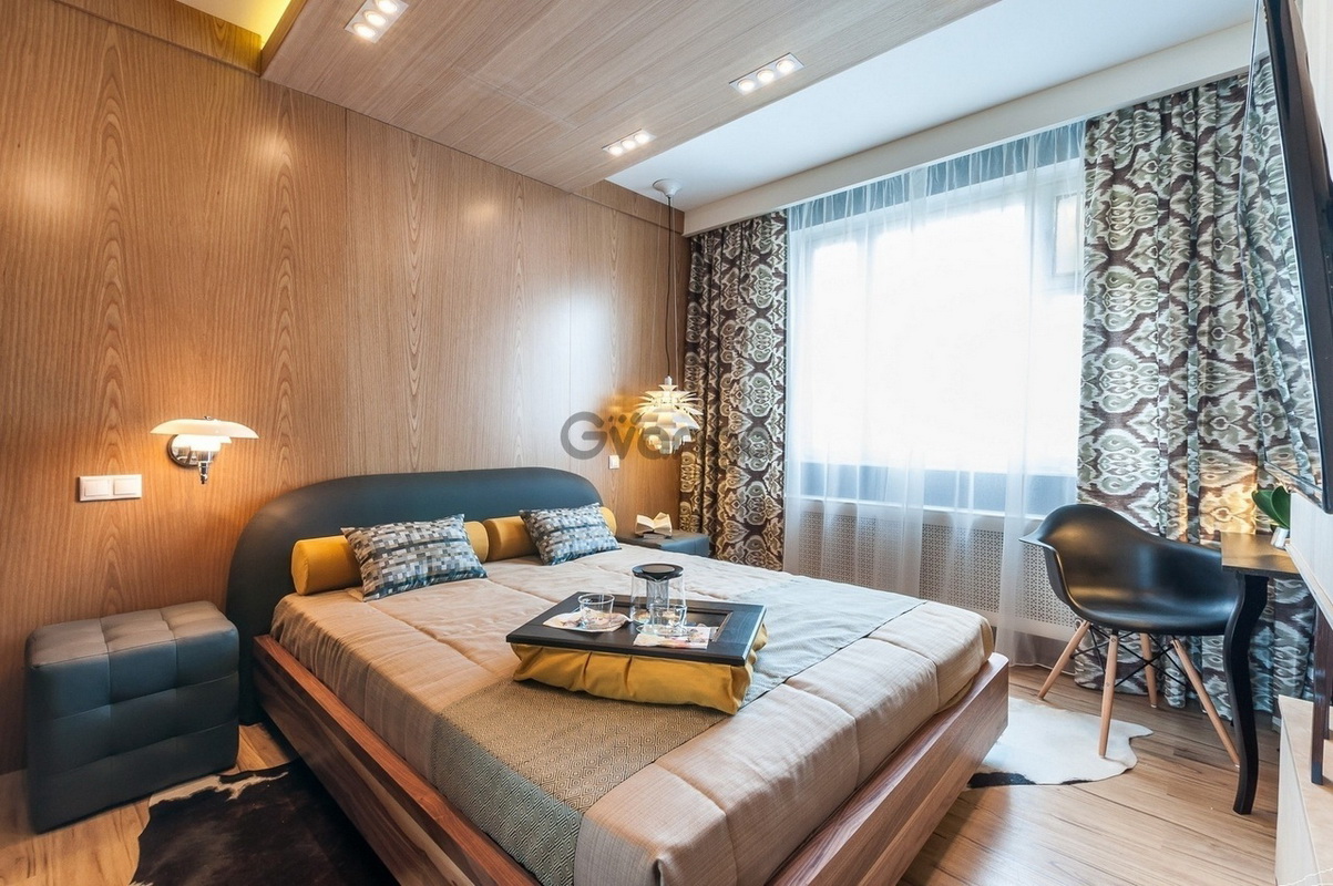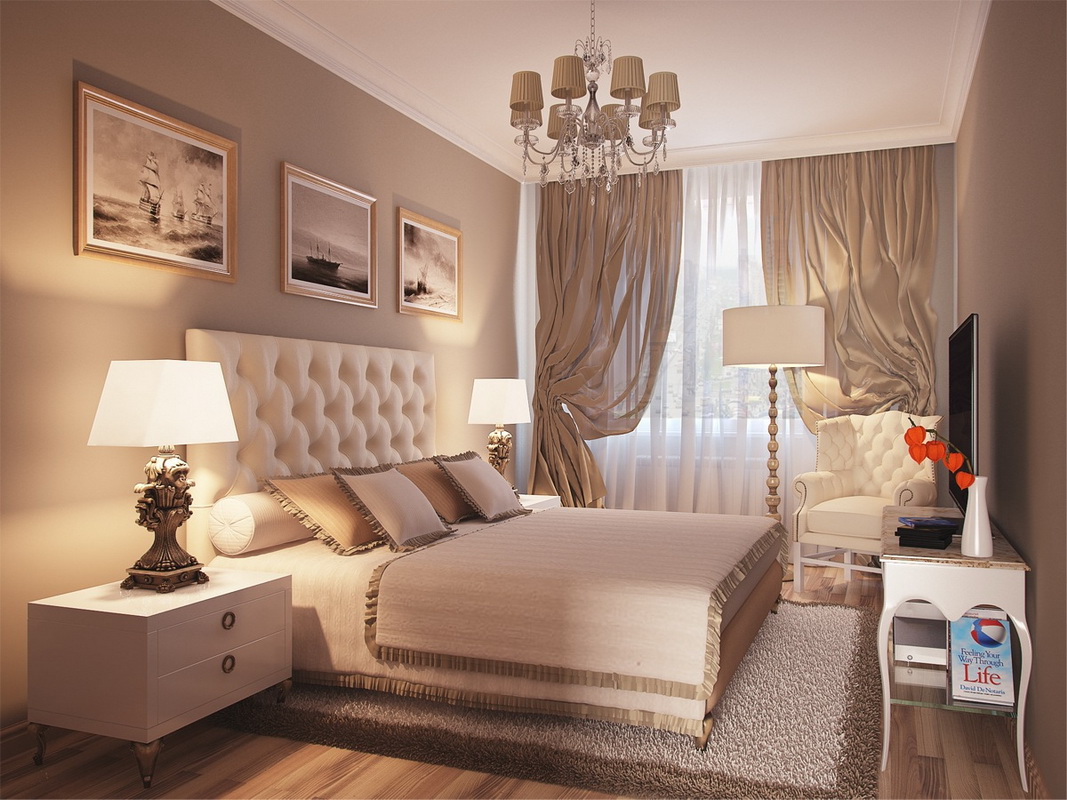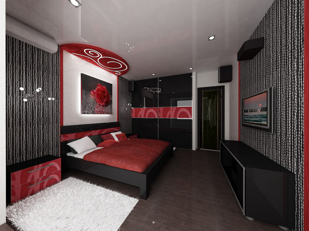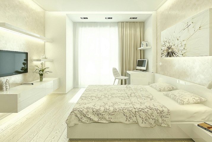 In einem langen und schmalen rechteckigen Raum ist es besser, ein Bett senkrecht zu einer langen Wand zu haben, wodurch ein Rhythmus entsteht und das Gefühl der Monotonie des Raums verschwindet. Aber der quadratische Raum ist in Bezug auf die Möbelplatzierung am vorteilhaftesten, da die Proportionen des Raumes anfangs korrekt sind. Es ist besser, das Bett mit dem Kopfteil gegen die Wand zu stellen, den Schrank in der dunkelsten Ecke zu entfernen und den leichtesten Raum mit einem Sessel und einem kleinen Tisch an den Ruhebereich anzupassen.Es ist wichtig, dass das Bett nicht sichtbar war oder nicht vollständig sichtbar war, wenn die Tür zum Zimmer offen ist, so dass Komfort und Gemütlichkeit zunehmen.