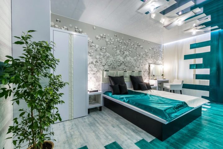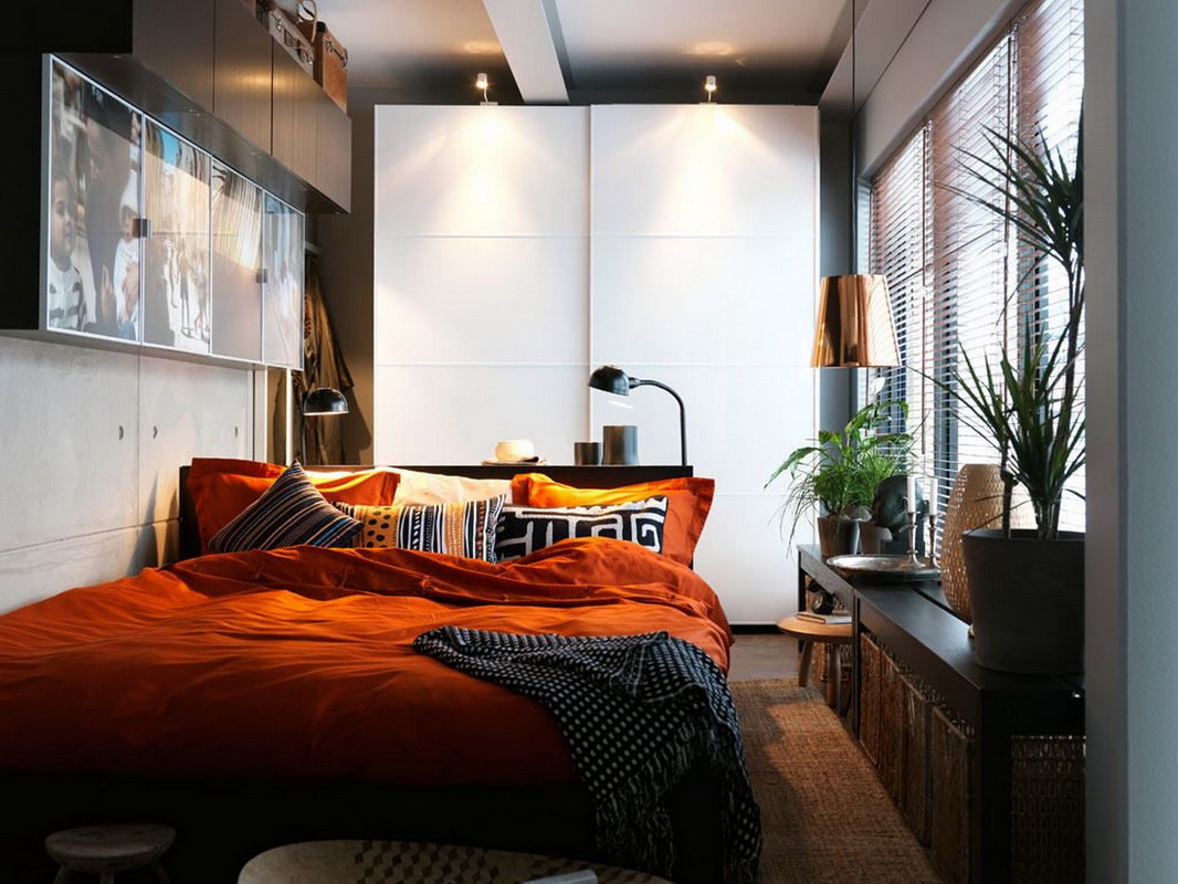 Bei einem kleinen und engen Raum ist es besser, das Bett in einem Winkel zu positionieren und den verbleibenden Platz zum Beispiel für Lagerungssysteme zu nutzen. Dies wird eine neue Richtung für das Aussehen des Raumes setzen und seine kleine Größe wird weniger auffällig sein.