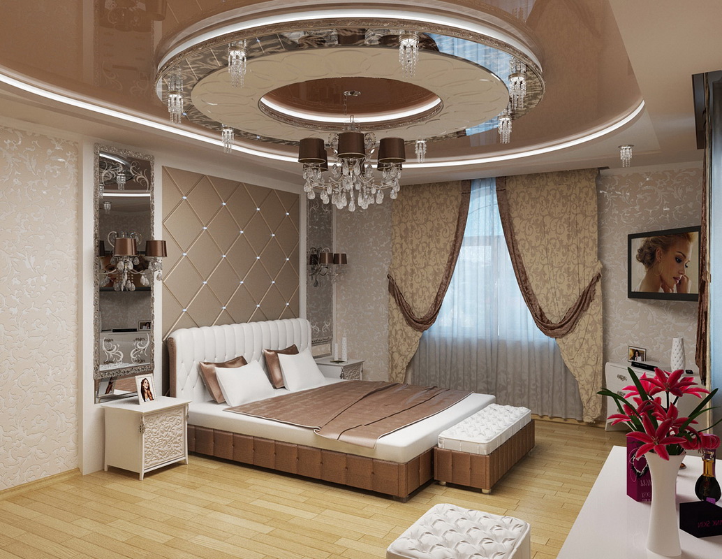 Für ein Schlafzimmer von 14 Quadratmetern. m nicht geeignet für modische runde und hängende Betten, für ein solches quadratisches passendes Bett standard rechteckige Form, aber es gibt eine große Auswahl an Korpussen und Kopfteilen. Es ist notwendig, Rahmen mit abgerundeten Ecken oder zu bevorzugenaus Schaumstoff gefertigt, reduziert es das Verletzungsrisiko. Das Kopfteil wird auf der Grundlage der Abmessungen des Raumes ausgewählt.