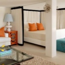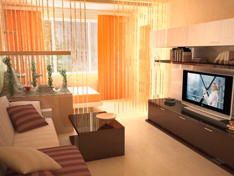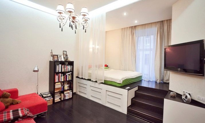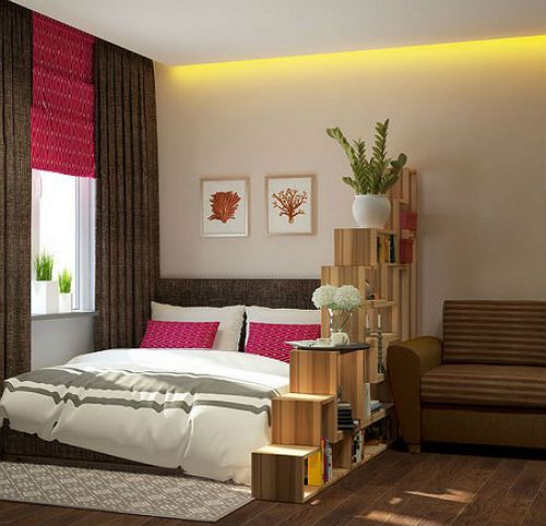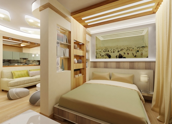 - Vorhänge. Textilien teilen Zonen gut und fügen Raum Leichtigkeit hinzu. Sie können die Vorhänge immer öffnen, optisch den Raum erweitern und zur richtigen Zeit, zum Beispiel am Abend, schließen, wodurch das Schlafzimmer vom Empfangsbereich getrennt wird.Nicht nur leichte und transparente Vorhänge eignen sich zur Abgrenzung, sondern auch dick.