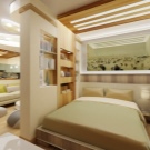 Wenn das Haus hohe Decken hat, kann das Bett auf dem Laufsteg versteckt werden. Zum Zeitpunkt des Schlafes dehnt es sich mit Hilfe von Rollen aus und bewegt sich dann wieder.