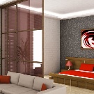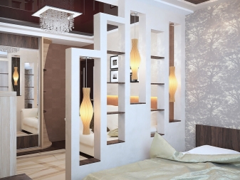 - Partitionen. Sie kommen aus einer Vielzahl von Materialien: Holz, Glas, Trockenbau. Manchmal ist die Trennwand mit dem Kopf des Bettes durch diese Technik verbunden, so können Sie den Schlafplatz vor neugierigen Blicken eingrenzen.