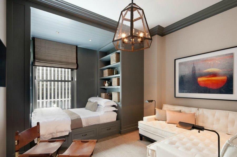 Die Möbel, die das Schlafzimmer-Wohnzimmer schmücken, können helfen, das ursprüngliche Zimmer anzuordnen.
