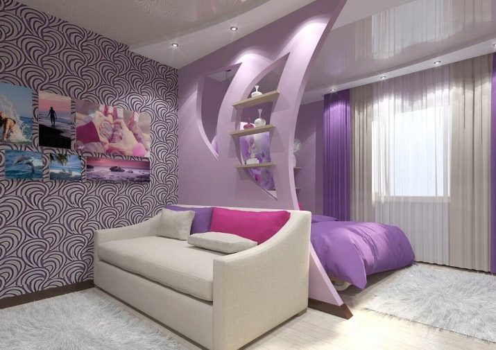 Möbel und andere Möbel in originellen Farben werden auch große Helfer in der Frage der Raumzonierung sein. Zum Beispiel im Wohnzimmer können Sie reichen lila - Lila Teppich, lila Osmanen, einen Kronleuchter in den gleichen Farben.
