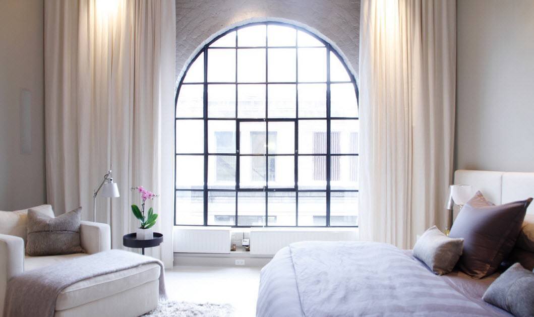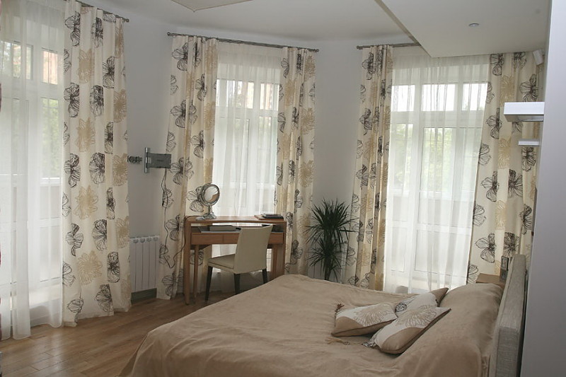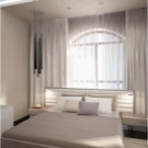 - Wenn Sie ein glücklicher Besitzer eines Schlafzimmers mit einem halbkreisförmigen Fenster sind, empfehlen die Designer einfarbige Vorhänge auf dem Boden und decken nur die Wände mit einem einfachen Vorhang ab.