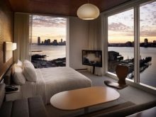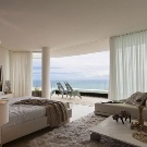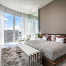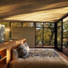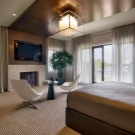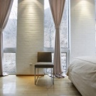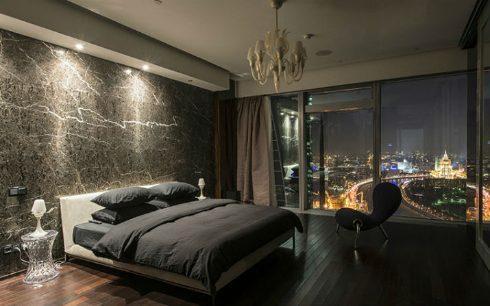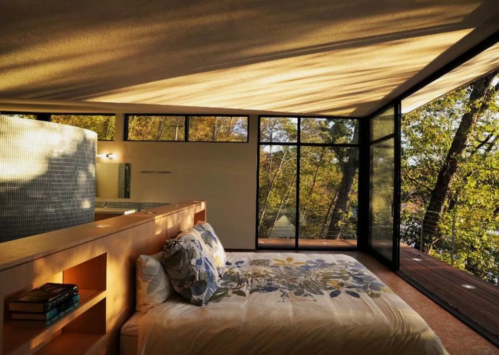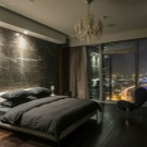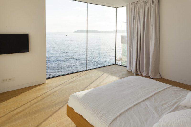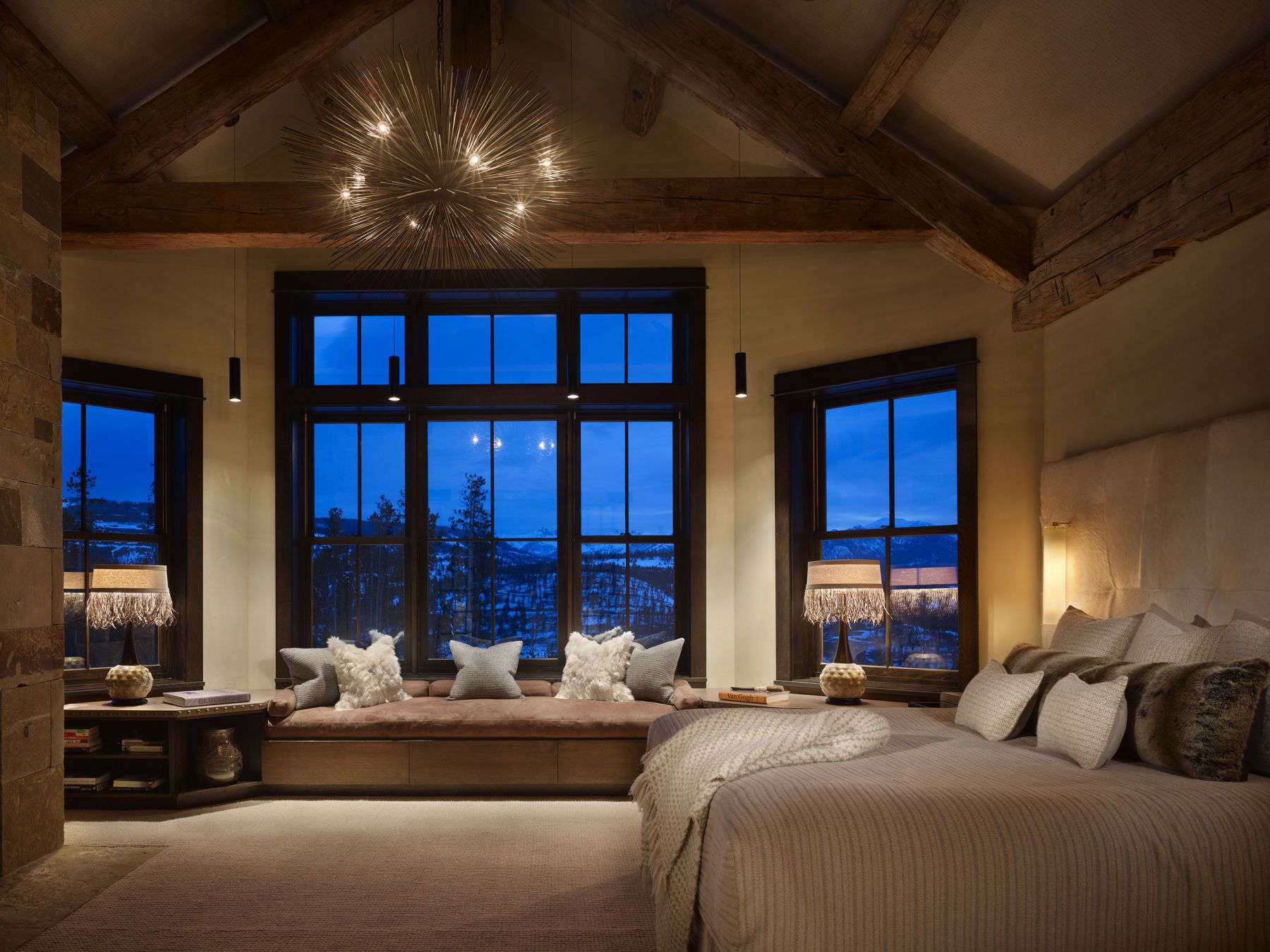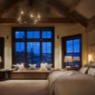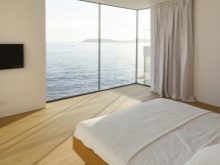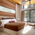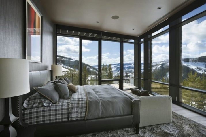 Große Fenster im Schlafzimmer - der ultimative Traum. Sie sind der Hauptakzent im Raum und benötigen keine Dekoration, wenn sie ein malerisches Bild ergeben und es egal ist, ob es eine Stadt oder eine natürliche Landschaft ist. Vorhänge werden eher für den Komfort der Besitzer benötigt, besonders im Dunkeln, wenn sich der Blick auf das Schlafzimmer den Augen der Passanten öffnet.