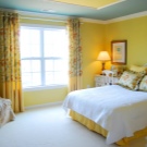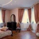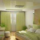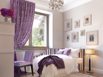 Niedrig gelegen Das Fenster wird durch eine versteckte Traufe korrigiert oder so hoch wie möglich an der Decke aufgehängt. Wenn die Decken im Schlafzimmer niedrig sind und das Fenster klein ist, ist die einzige Lösung, den Raum mit dem vertikalen Muster auf den Vorhängen einzustellen. Es ist notwendig, die Lambrequins und drei Schichten von Vorhängen zu verlassen und prägnante monochrome Vorhänge oder gestreifte Modelle zu wählen.