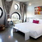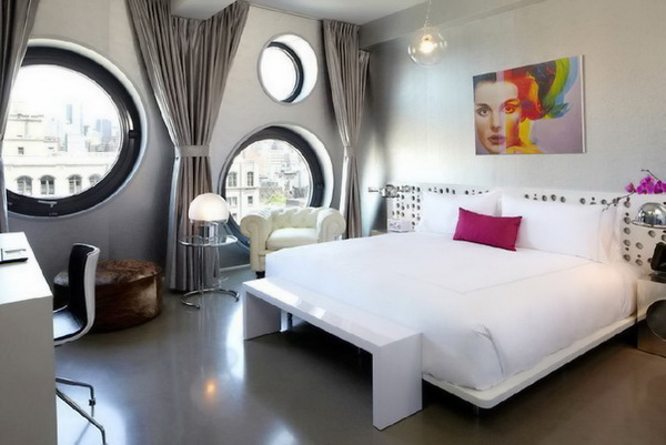 Schlafzimmer mit einer runden Öffnung - eine Art U-Boot in Ihrem Haus. Wenige thematische Details und Dekor werden das klassische Schlafzimmer zur Verkörperung der Idee eines Designers machen.
