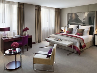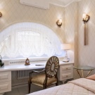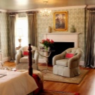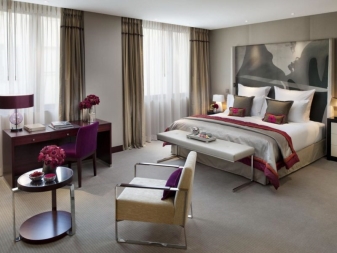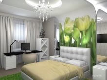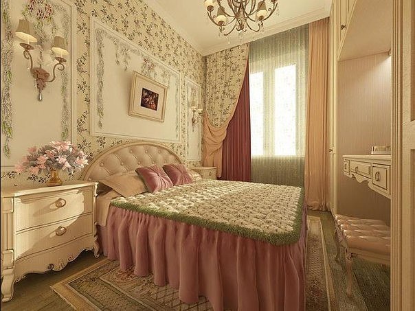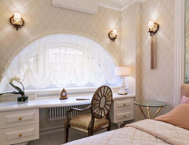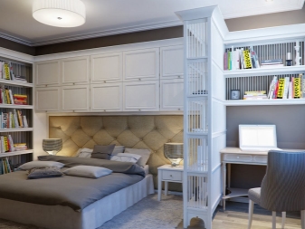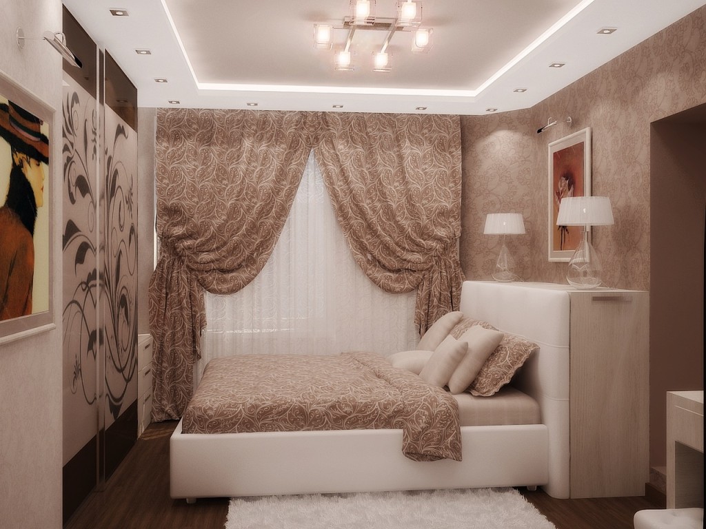 Wenn der Raum groß ist, können Sie das Schlafzimmer und das Wohnzimmer in demselben Raum kombinieren. Dann werden die Fenster einen Sitzbereich für Gäste haben, und im geheimen Teil oder dem dunklen Bett und Schminktisch, Kommode.