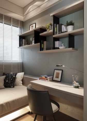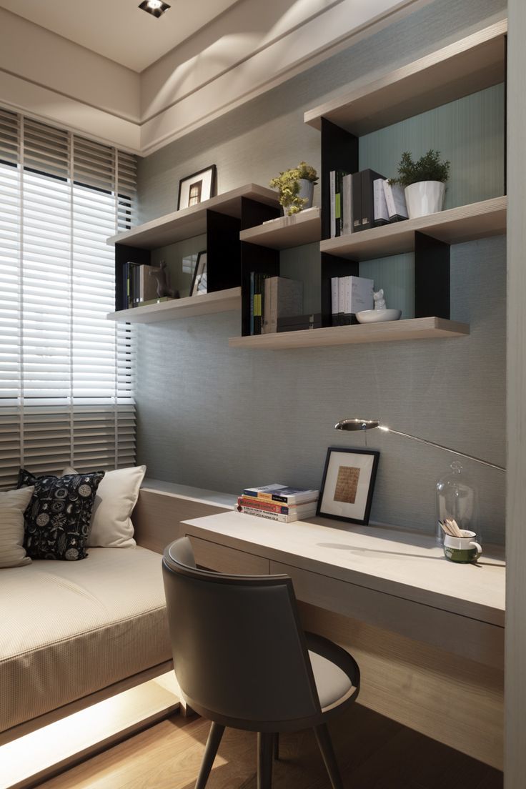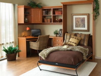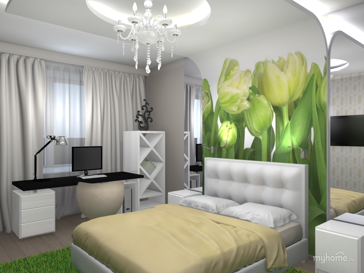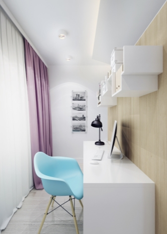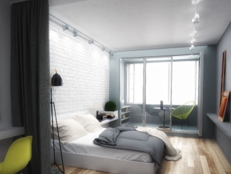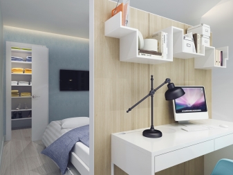 Der Arbeitsbereich am Fenster ist nicht immer eine gute Lösung, wenn diese Möbelanordnung nicht zum Eigentümer des Raumes passt. Der Schreibtisch kann am Anfang des Raumes positioniert werden, am Ende wird das Bett aufgestellt und der Schlafbereich mit einem eleganten Gestell oder einer dünnen Trennwand begrenzt.