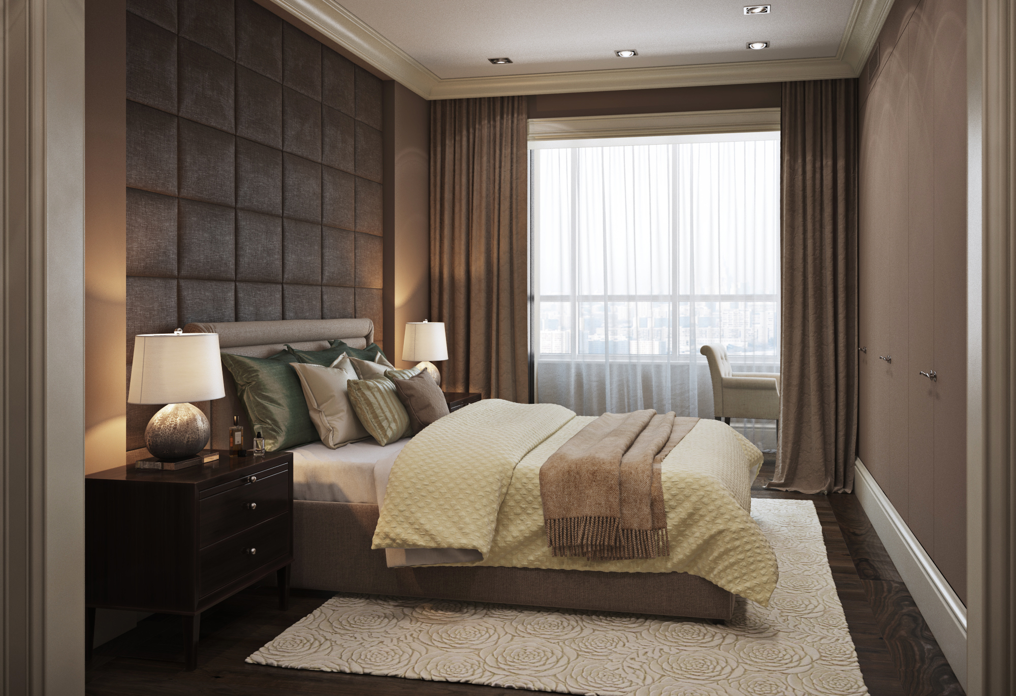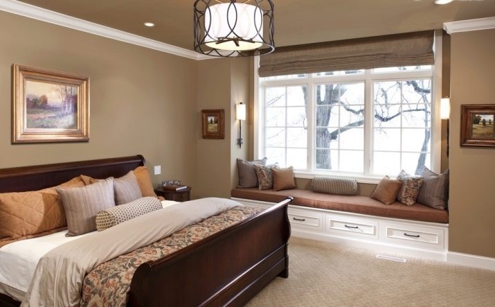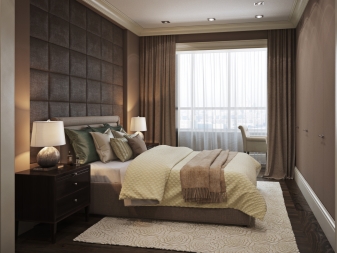 - Ein Schlafzimmer mit einem großen Fenster ist ein guter Grund, dunkle Möbel und Möbel zu verwenden.und in diesem Fall Brauntöne. Hier ist alles nach den Regeln des guten Geschmacks - eine Akzentwand, schlichte beige Wände und lakonische Vorhänge bis zum Boden, massive Holzmöbel und viele Textilien.