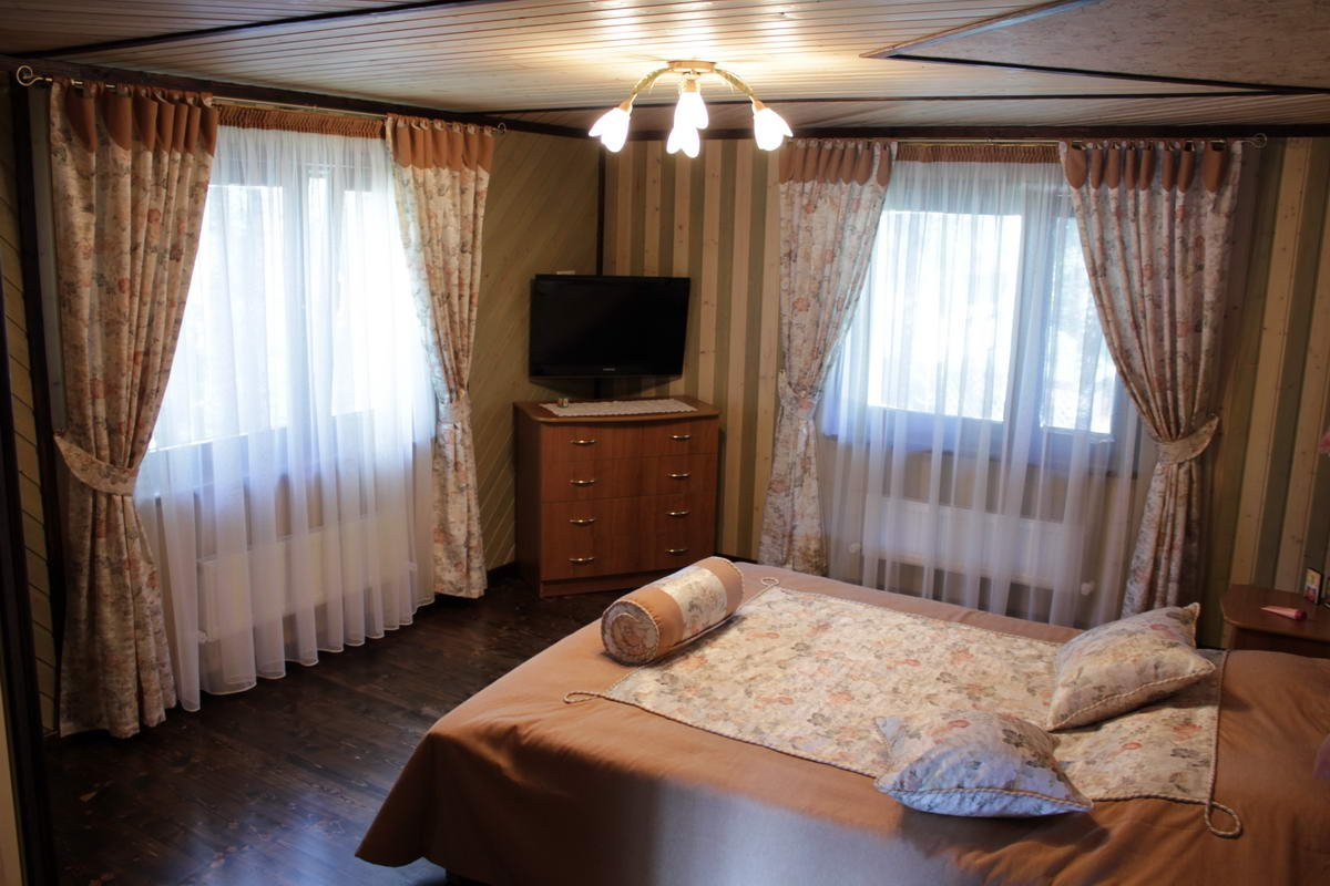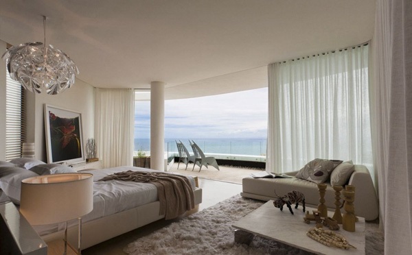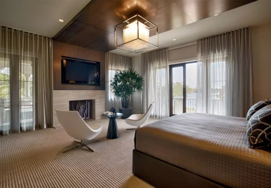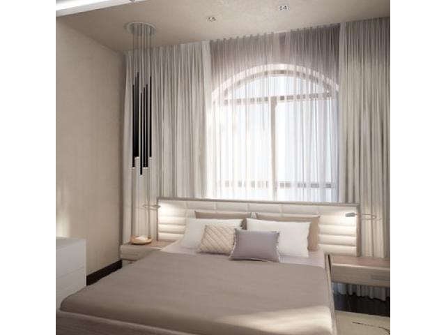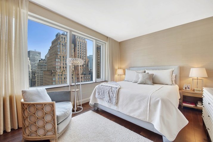 Für Panoramafenster im Schlafzimmer passen lange Lichtvorhänge aus transluzentem Stoff, die breiter und länger sind als die Öffnungen - das schafft einen gewissen Chic und Eleganz im Innenraum.