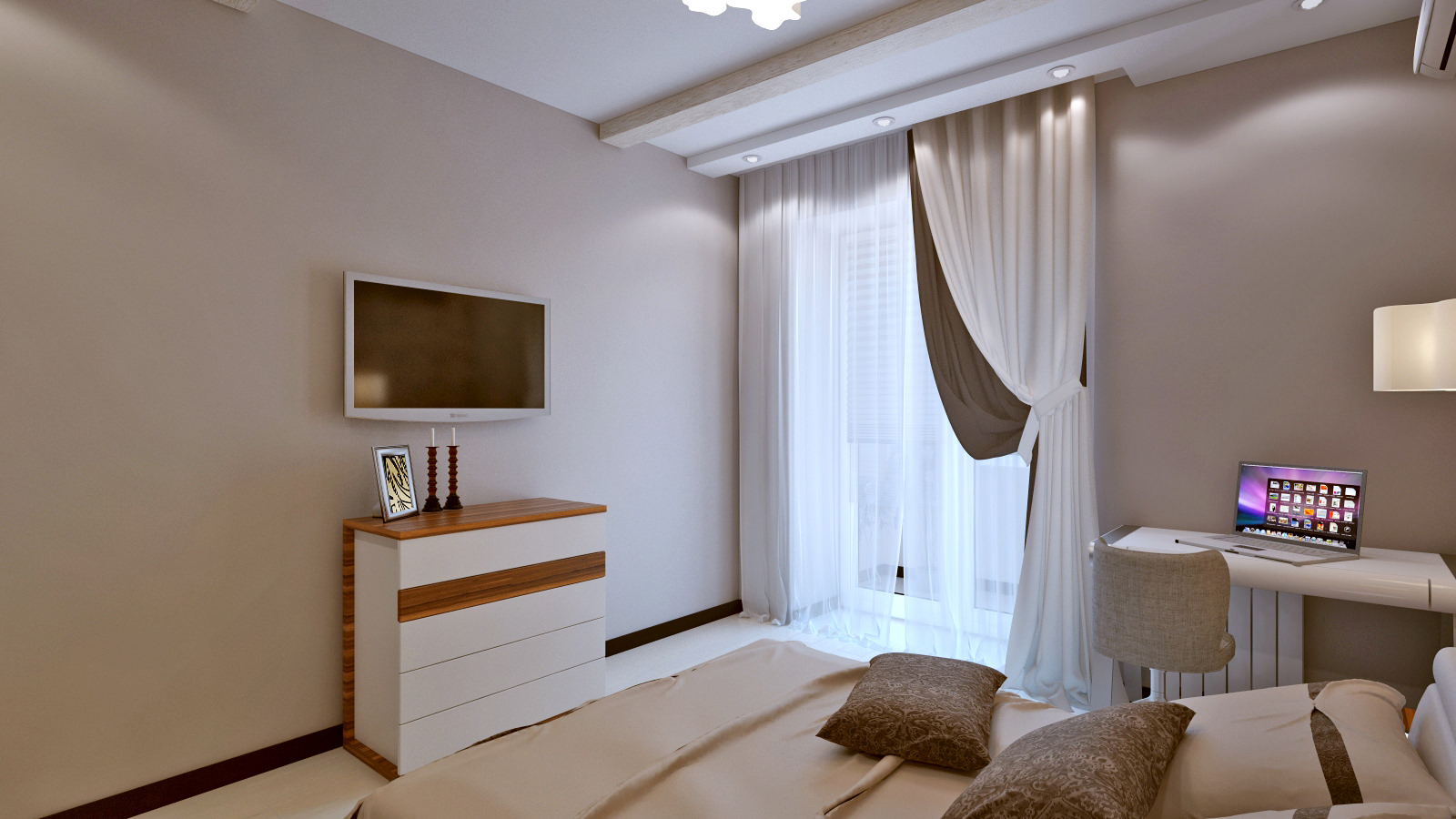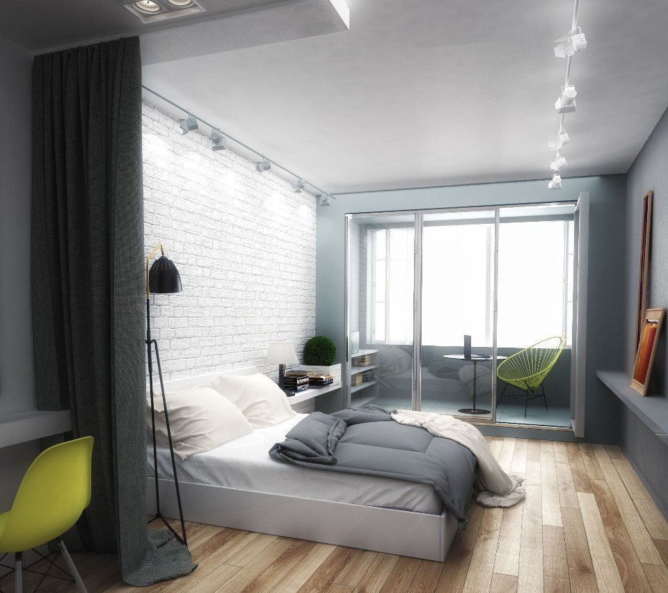 Hier ist ein Beispiel für eine gelungene Einrichtung von Möbeln für ein kleines Schlafzimmer. Bitte beachten Sie, dass sich der Arbeitsbereich am Balkonausgang gegenüber dem Fenster befindet.