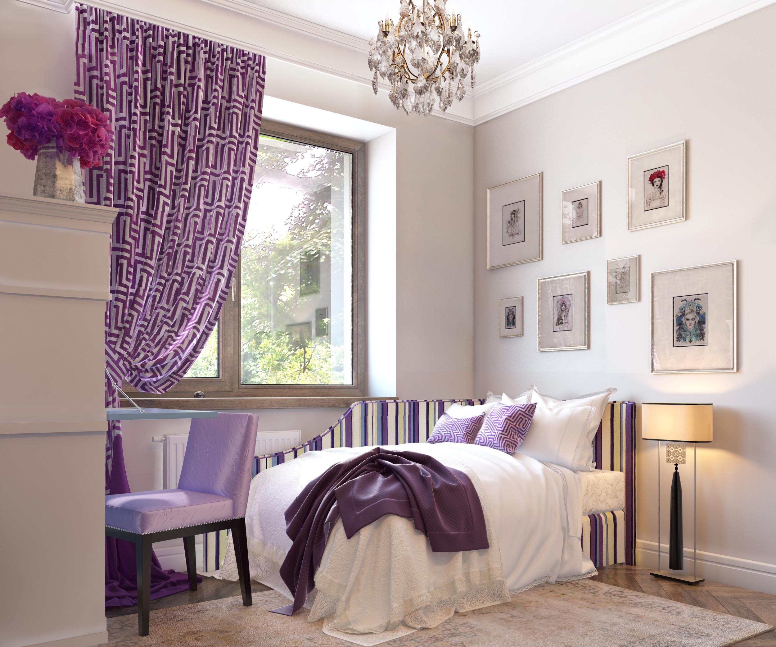 - Die Lage des Bettes am Lumen ist besonders für ein Jugendzimmer geeignetund in diesem Fall Mädchen. Ein einziges Farbschema (lila-weiß) harmoniert gut mit dem bescheidenen Quadrat des Raumes und dem einzigen kleinen Fenster in der Ecke.