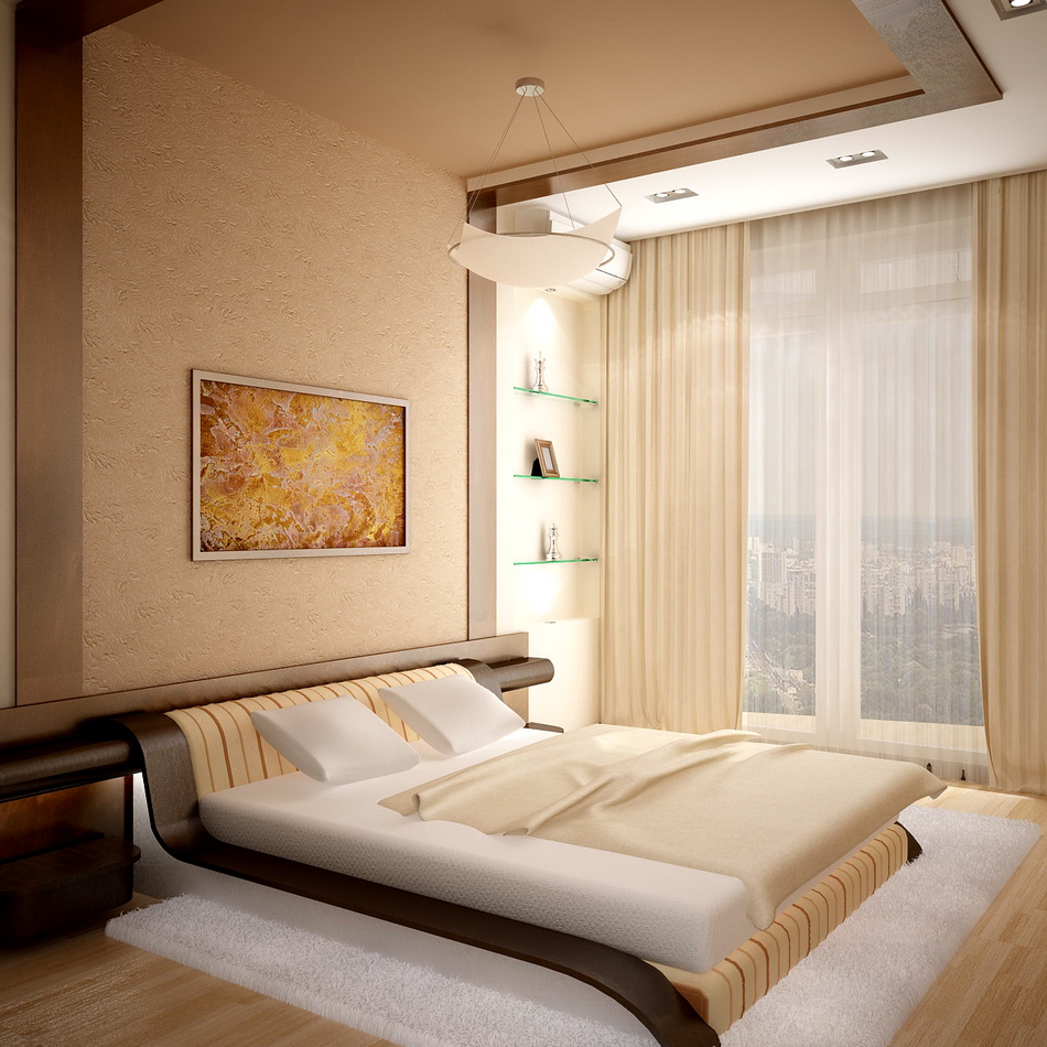Für ein zu helles Schlafzimmer, wählen Sie die Farbe der Wände gedämpft, in Pastelltönen, weil weiß Ihre Augen blenden wird, wird hell schnell müde werden. Die beste Wahl wäre Blau, Pfirsich, Terrakotta, reiche Beige, Braun, Graue Farbe von Tapeten und Farbe oder Wandpaneele mit einem Muster aus Stein, Holz.