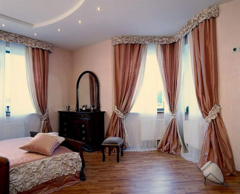 Nicht-Standard-Zimmer mit zwei Fenstern - eine große Chance für die Verwirklichung von Wohnkomfort. Zuerst müssen Sie den Stil des Schlafzimmers bestimmen - klassisch, modern, Provence, Loft, Minimalismus oder Barock, und nur dann können Sie Textilien aufheben.