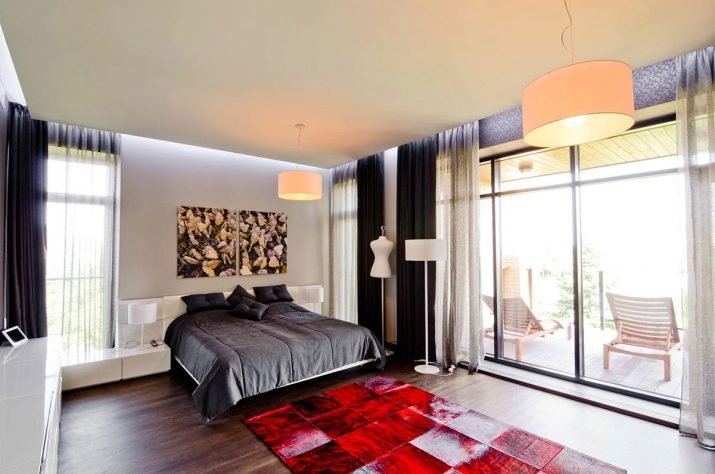 Riesige Türen im Schlafzimmer harmonieren mit hellen Stoffen und einer entspannten Atmosphäre - stilvolle, moderne und funktionale Möbel. Es ist wichtig, die Vorhänge passend zum Interieur zu wählen, da unpassende Träger im Schlafzimmer im Stil von Loft lächerlich aussehen,egal wie teuer und schön sie auch waren, und die Jalousien passen nicht zu den Klassikern, obwohl sie sehr praktisch sind.