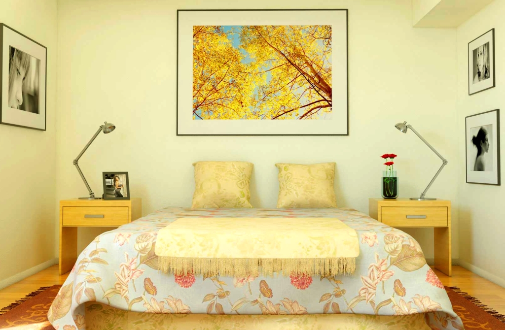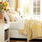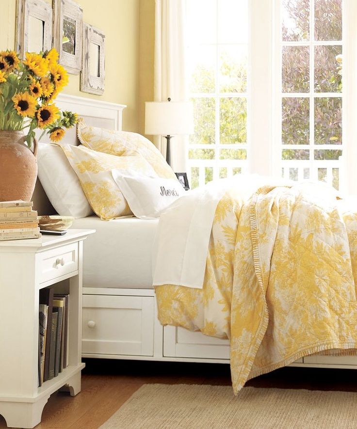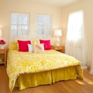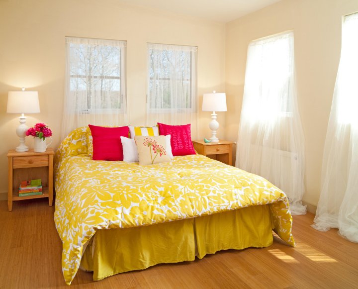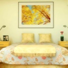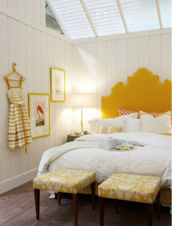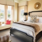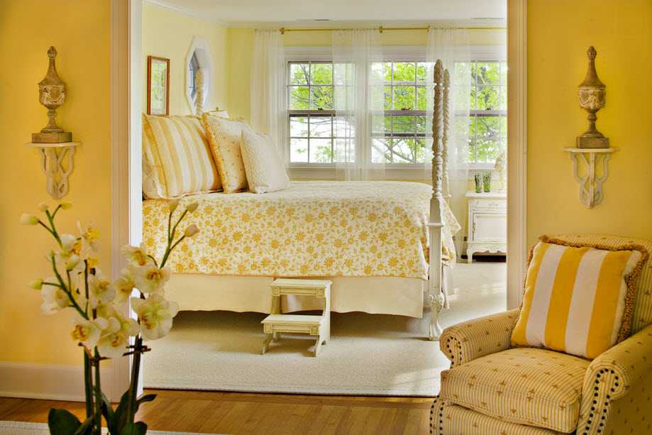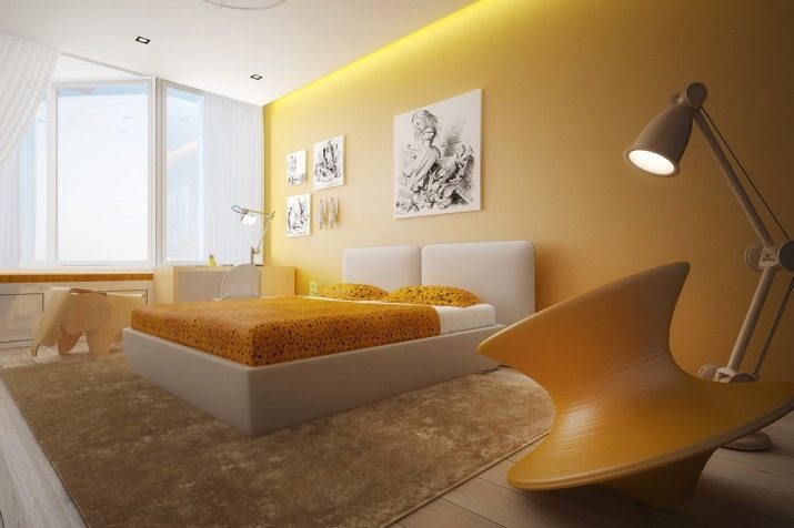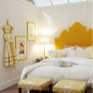 Wenn Sie diese Farbe für die Dekoration des Schlafzimmers in einem warmen Bereich wählen, wäre Gelb mit einem Hauch von Orange ideal. Die Farboption mit leichtem Grünton erfüllt die Aufgabe nicht.