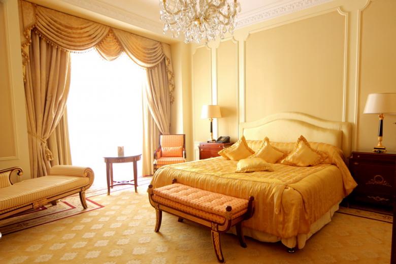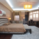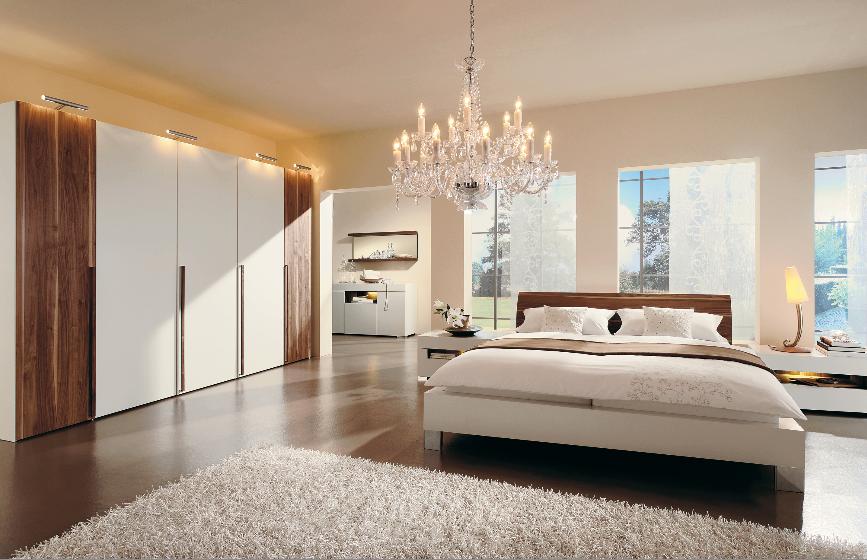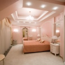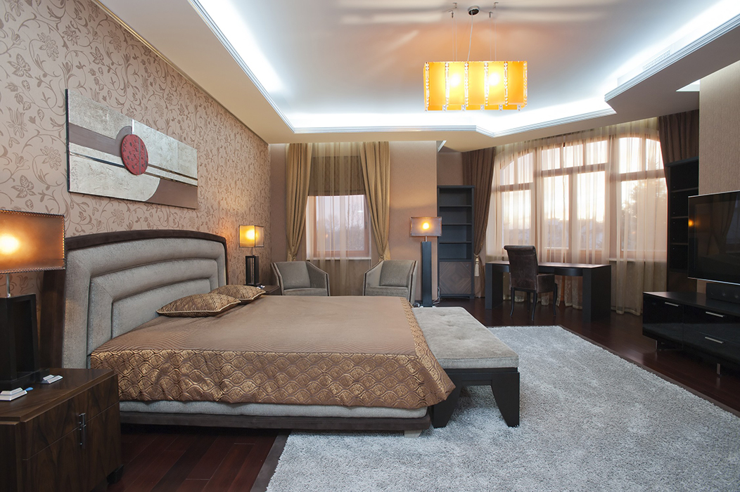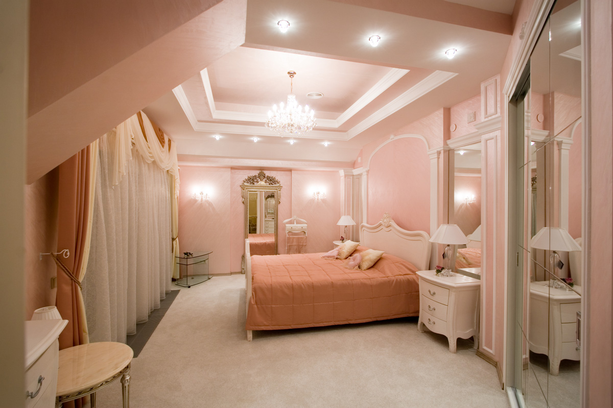 - Vergessen Sie nicht die Hauptbeleuchtung, die traditionell platziert ist - in der Mitte der Decke. Wenn wir von einem Schlafzimmer im minimalistischen Stil sprechen, dann sollte es eine Lampe von einfacher Form sein.Für einen Barock- oder Rokoko-Raum ist ein großer Kronleuchter mit Glasanhängern ideal.