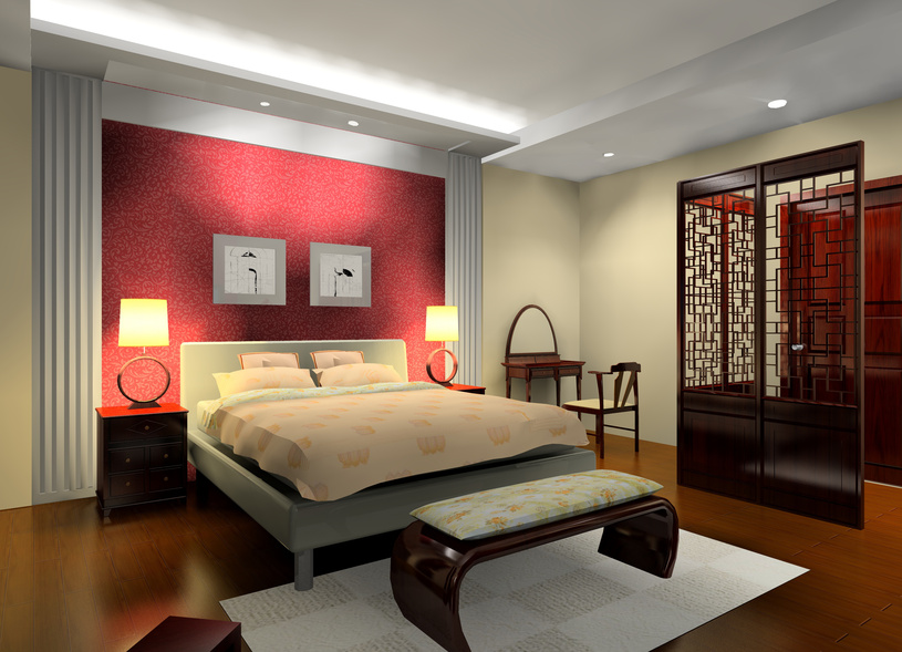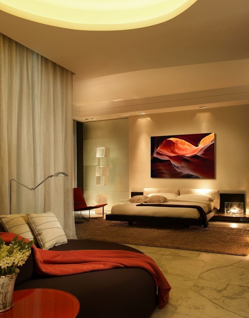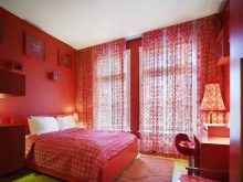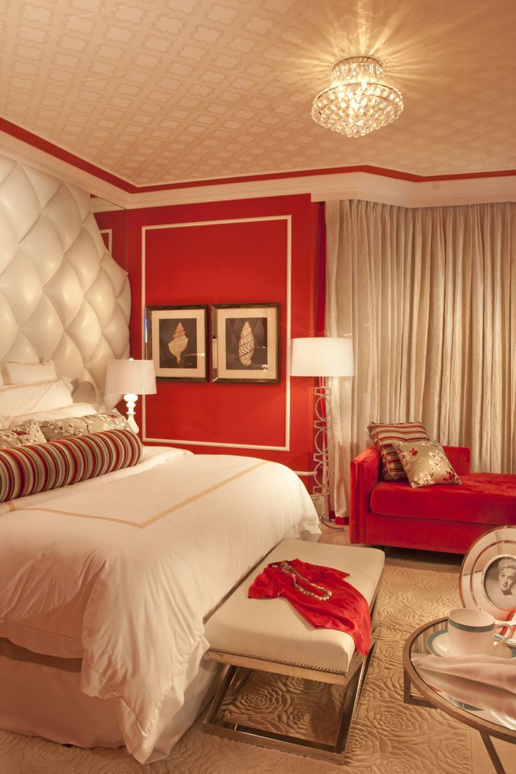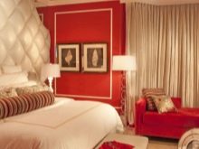 Rot ist Leidenschaft, Liebe, Feuer und lebendige Emotionen. Diese Farbe wird aktiv für die Inneneinrichtung verwendet. Designern wird empfohlen, diese Farbe für das Schlafzimmer sorgfältig zu verwenden, weil es den Geist anregt, und in diesem Teil des Hauses müssen Sie sich entspannen und ausruhen. Diese Farbe wird am besten als Ergänzung zu einem neutralen und ruhigen Bereich verwendet. In diesem Fall werden die roten Farbtöne den Farbgrad im Raum nur geringfügig erhöhen, und anstelle der Unannehmlichkeiten durch übermäßig gesättigte Farben erhalten Sie ein stilvolles Design.