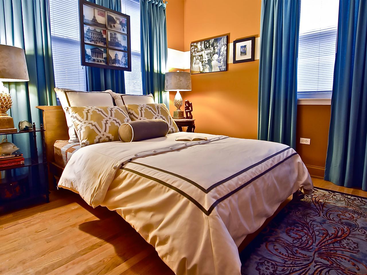 In so einem Schlafzimmer sieht die große Bettwäsche aus, die sowohl mit kleinen als auch großen hellen Mustern verziert ist. Vergessen Sie nicht die schönen Vorhänge. Sie sind ein wichtiges Element, um eine gemütliche Atmosphäre im Raum zu schaffen. Sie können die Farbtechnik verwenden. Zum Beispiel, wenn das Zimmer in orange Farbe dekoriert ist, wird empfohlen, bei der Auswahl der Bettwäsche oder Vorhänge eine dieser Farben zu bevorzugen.