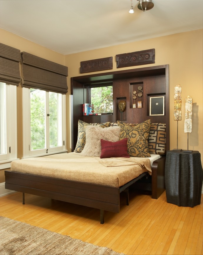 Um sich in einem in warmen Farben gehaltenen Raum wohl zu fühlen, empfiehlt es sich, dort ein Minimum an Möbeln zu installieren. Es wird genügend Couchtisch, Bett, Nachttische und einen kleinen Spiegel mit Spiegel geben. Das letzte Produkt wird vom fairen Geschlecht sehr geschätzt. Wenn es die Größe des Raumes erlaubt, können Sie einen Kleiderschrank oder ein paar Stühle in den Raum stellen. Um Platz zu sparen, entscheiden Sie sich für praktische und multifunktionale Möbel.
