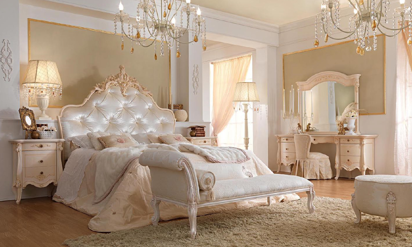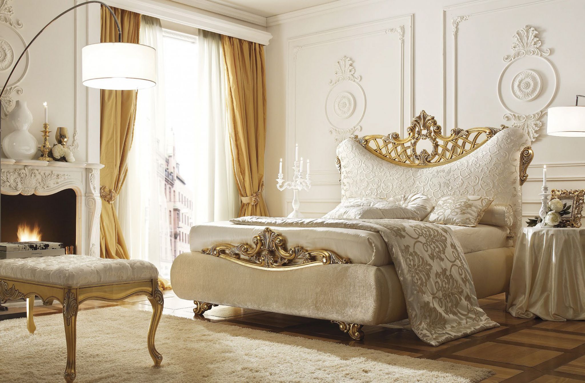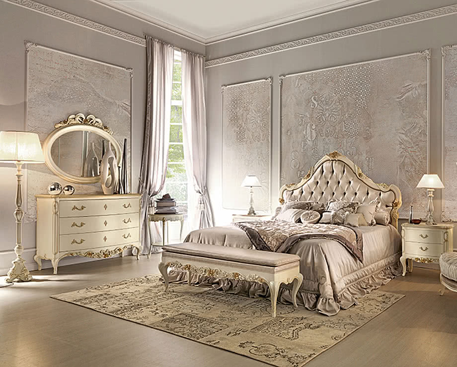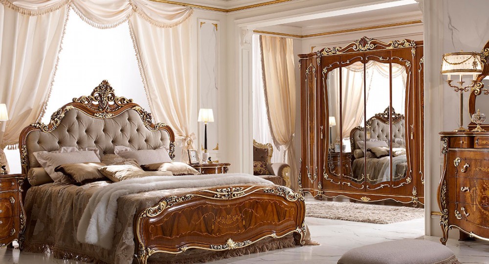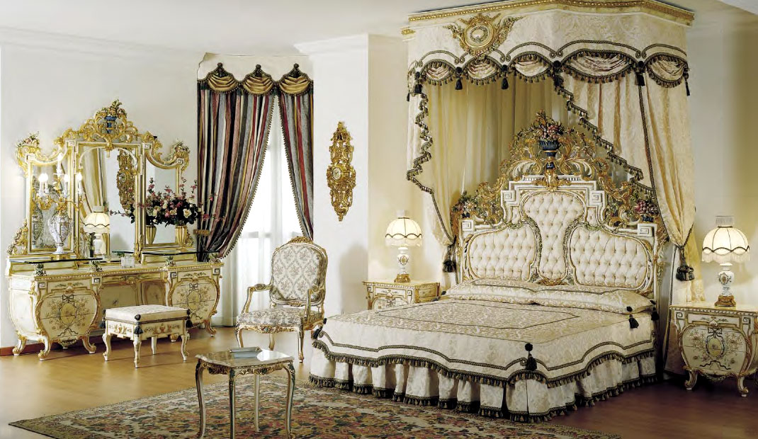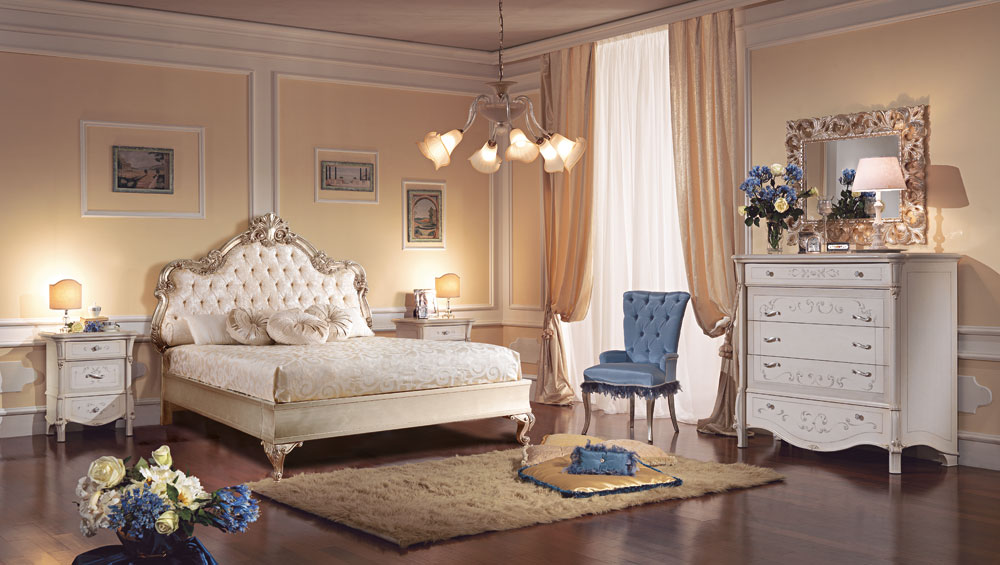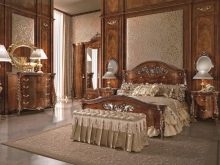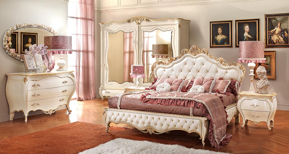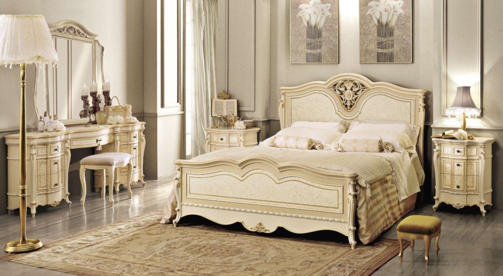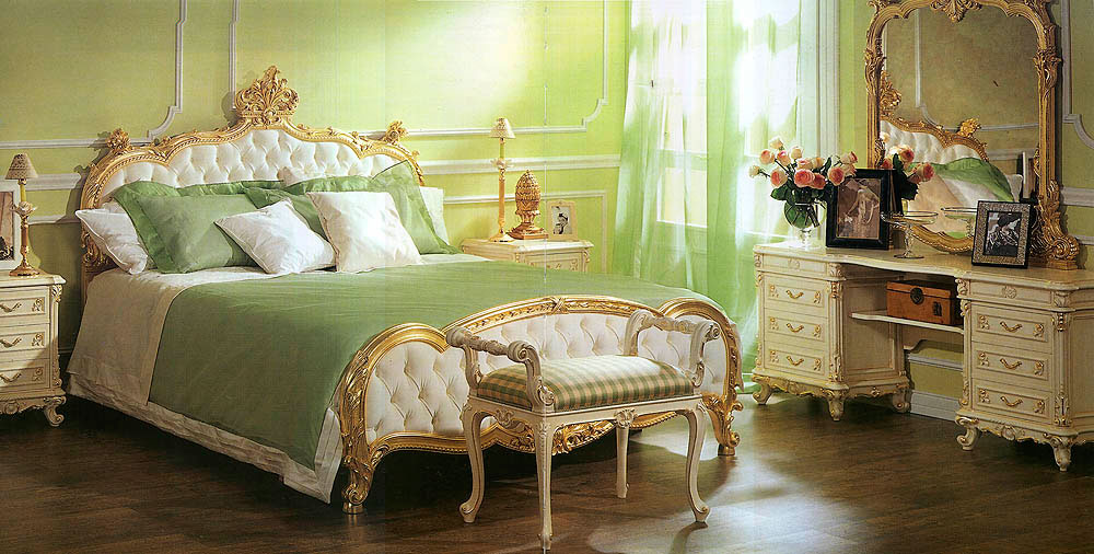 - Fans von Barock und Rokoko, im italienischen Konzept präsentiert, wie die Schlafzimmer Laccato mit ihrem inhärenten Prunk, Fülle von Goldschmuck auf Holz und hellen Farben, die die Möbeldimensionen geben.