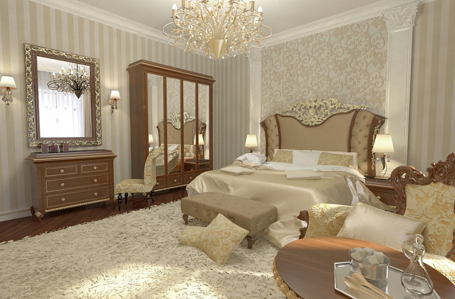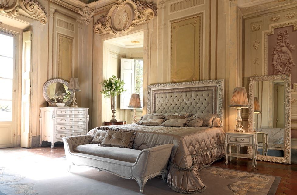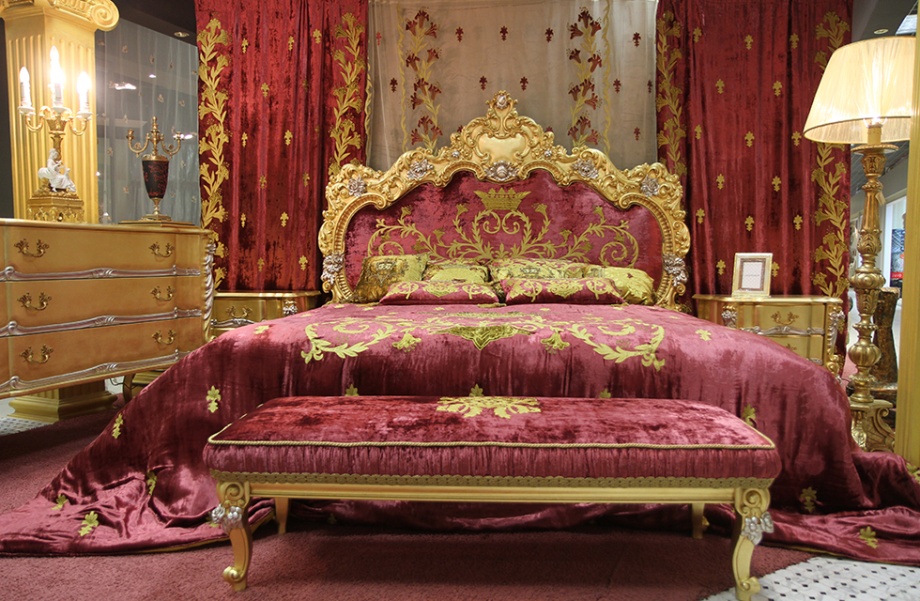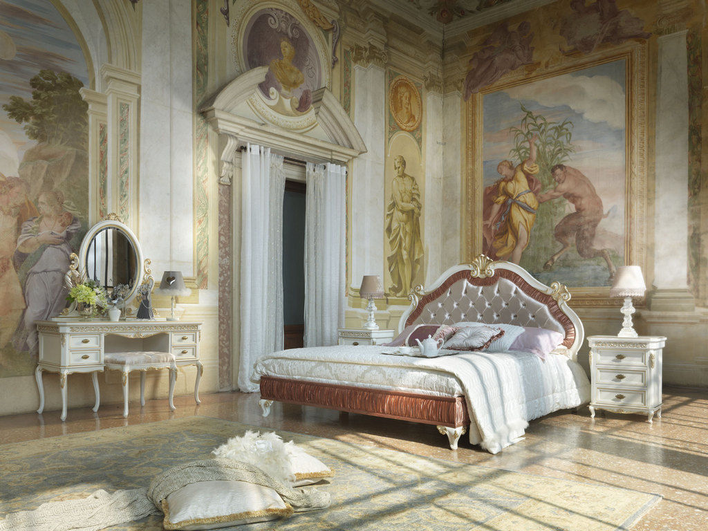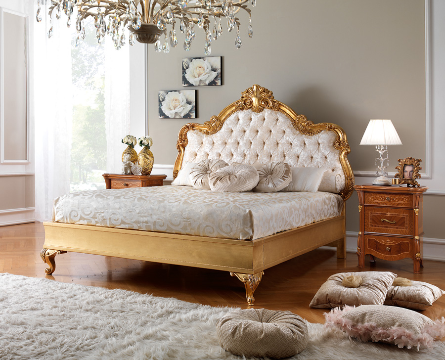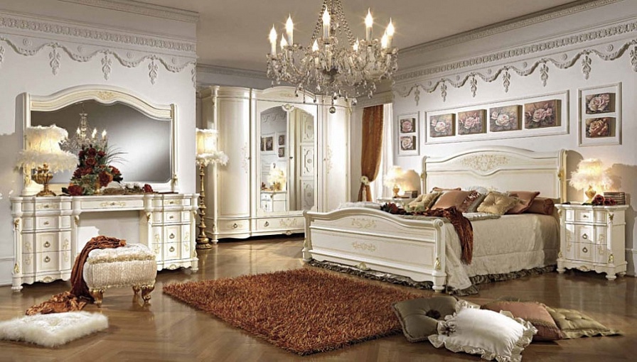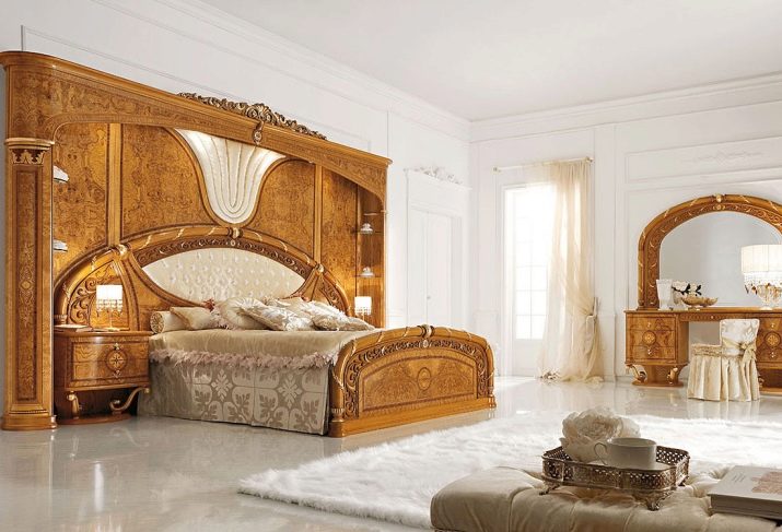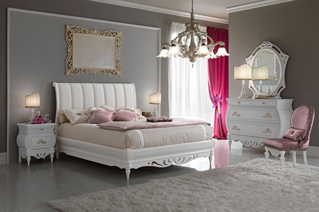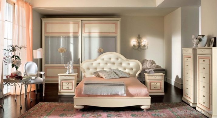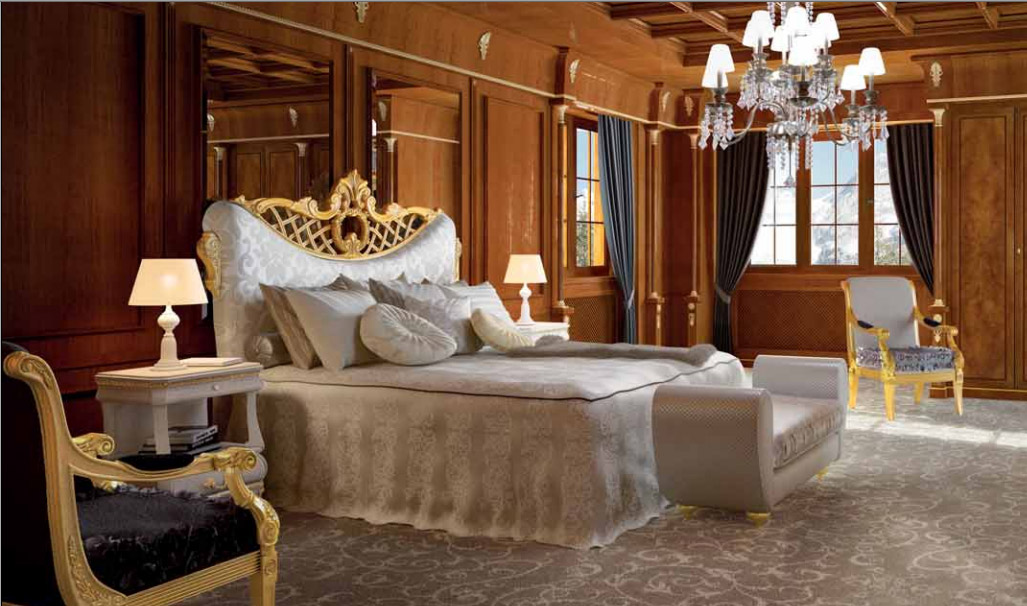- Fans von Barock und Rokoko, im italienischen Konzept präsentiert, wie die Schlafzimmer Laccato mit ihrem inhärenten Prunk, Fülle von Goldschmuck auf Holz und hellen Farben, die die Möbeldimensionen geben.