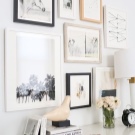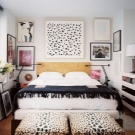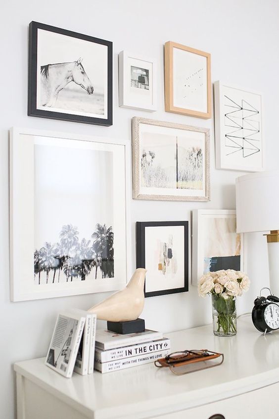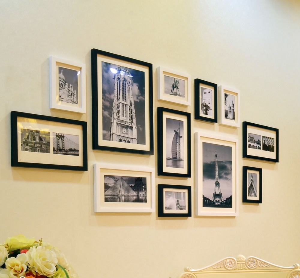 - der Modetrend begann an einer Wand zu lasten viele Bilder in verschiedenen Größen. Sie sind zufällig über die gesamte Wand verteilt, was die Illusion einer leichten Unordnung schafft und sich für zeitgenössische Stile eignet;