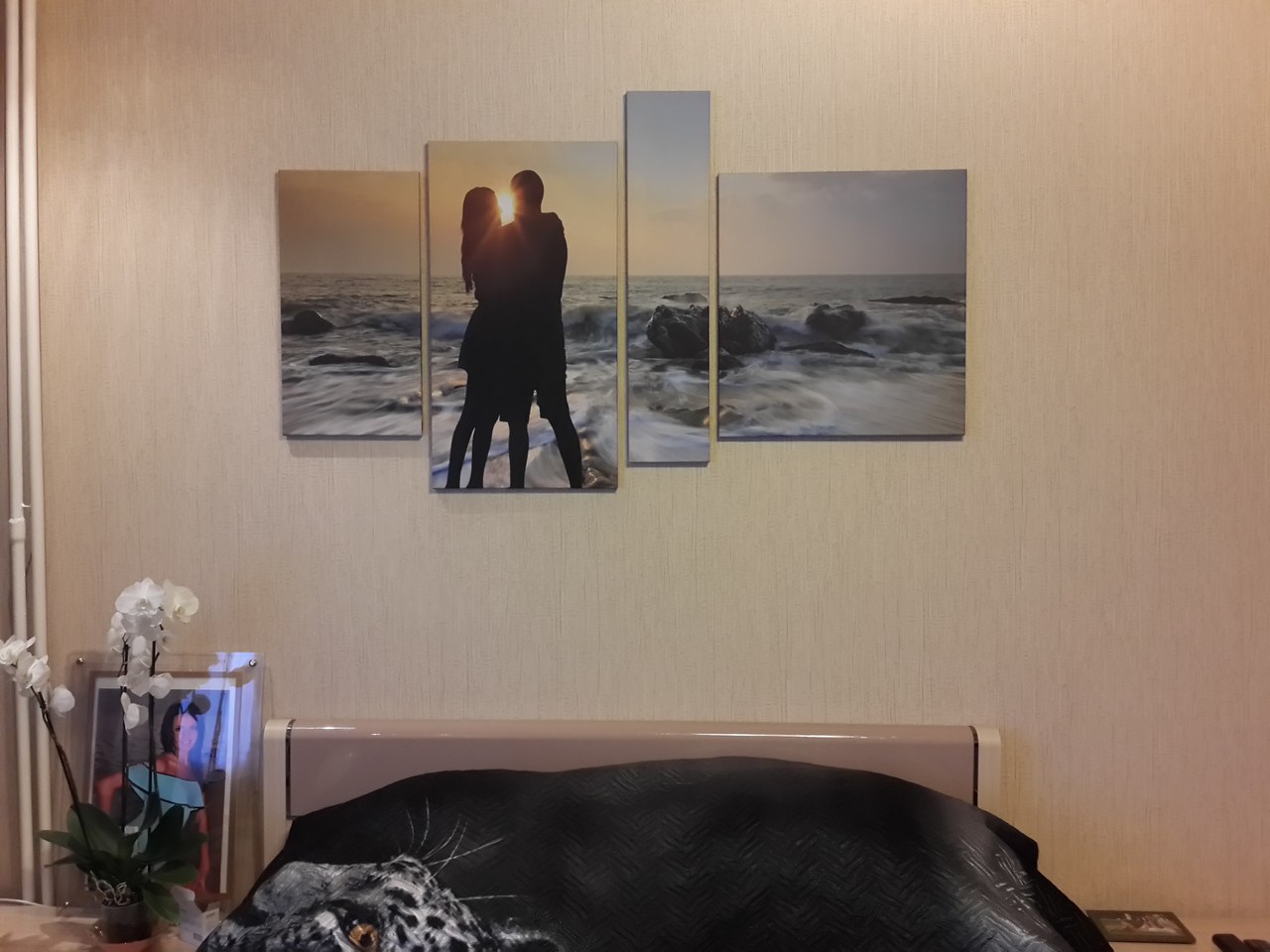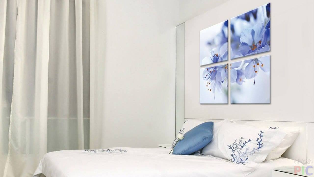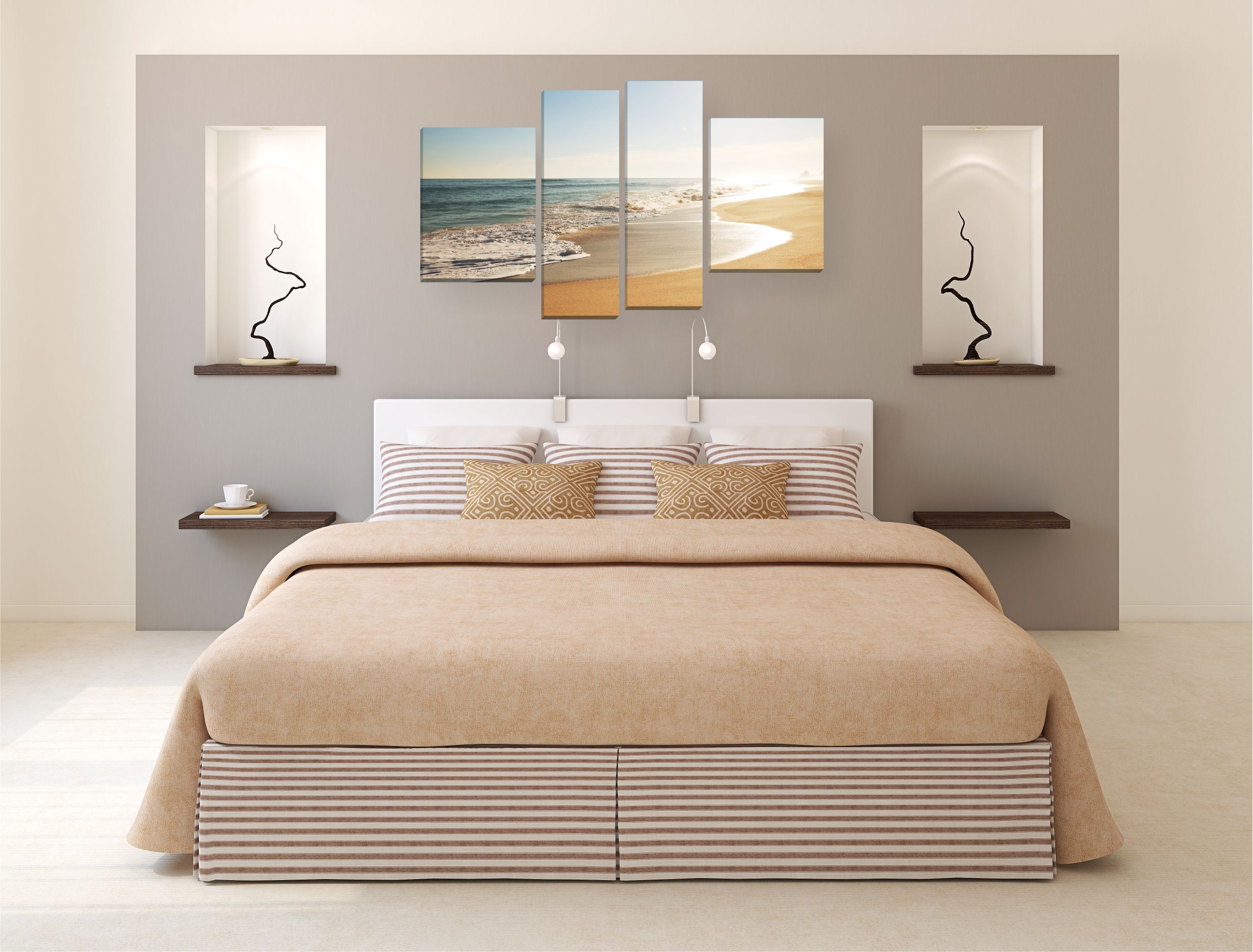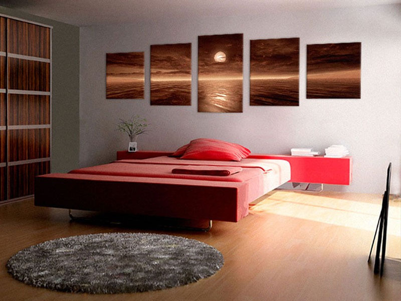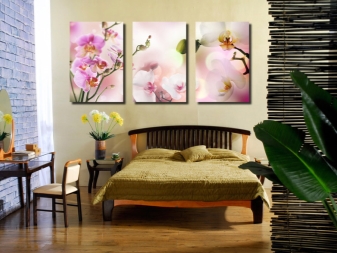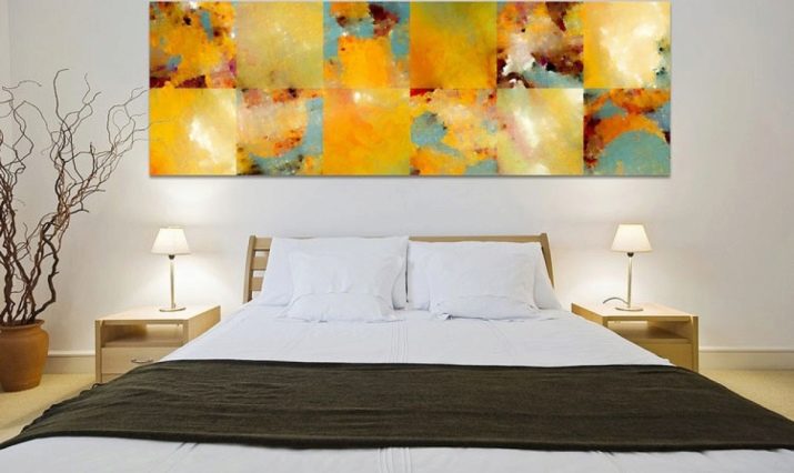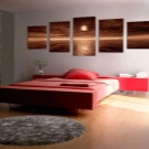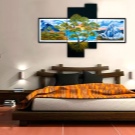 - zweifellos sind die Verkaufszahlen gestiegen modulare Kompositionenwenn eine fertige Handlung in mehrere separate Bilder unterteilt ist, die sich in Form und Größe unterscheiden können. Im Schlafzimmer ist es vorzuziehen zu benutzen Modul von 2-4 Teilenweil eine größere Zahl wie ein Durcheinander aussieht und eher einer Kunstgalerie als einem Schlafzimmer gleicht;