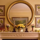 Sie können auch Arbeiten in verschiedenen Größen auf dem Regal platzieren, aber nicht viele. Drei - vier Bilder sind genug. Wichtig und Form des Bildes. Wenn im Schlafzimmer halbkreisförmige Fenster sind, eine gewölbte Nische, ein ovaler Spiegel, dann können Sie ein Bild mit runden Formen oder mit einem gemalten Kreis sicher aufhängen. In einem anderen Fall wird ein solches Bild nicht harmonisch aussehen wie ein fremdes Objekt.