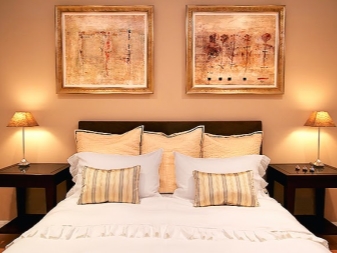 Es sieht gut aus zwei Bilder von mittlerer Größe, im gleichen Stil gemacht. Sie können über dem Bett oder über einem niedrigen Nachttisch, Schminktisch oder Kommode aufgehängt werden. Wenn es mehrere Leinwände gibt, aber nicht mehr als vier, und sie in der Größe unterschiedlich sind, dann wird empfohlen, sie mit der unteren Kante auszurichten und auf Augenhöhe zu hängen. Weil zu tief hängen, oder umgekehrt, zu hohe Gemälde verzerren die Geometrie des Schlafzimmers Raum.