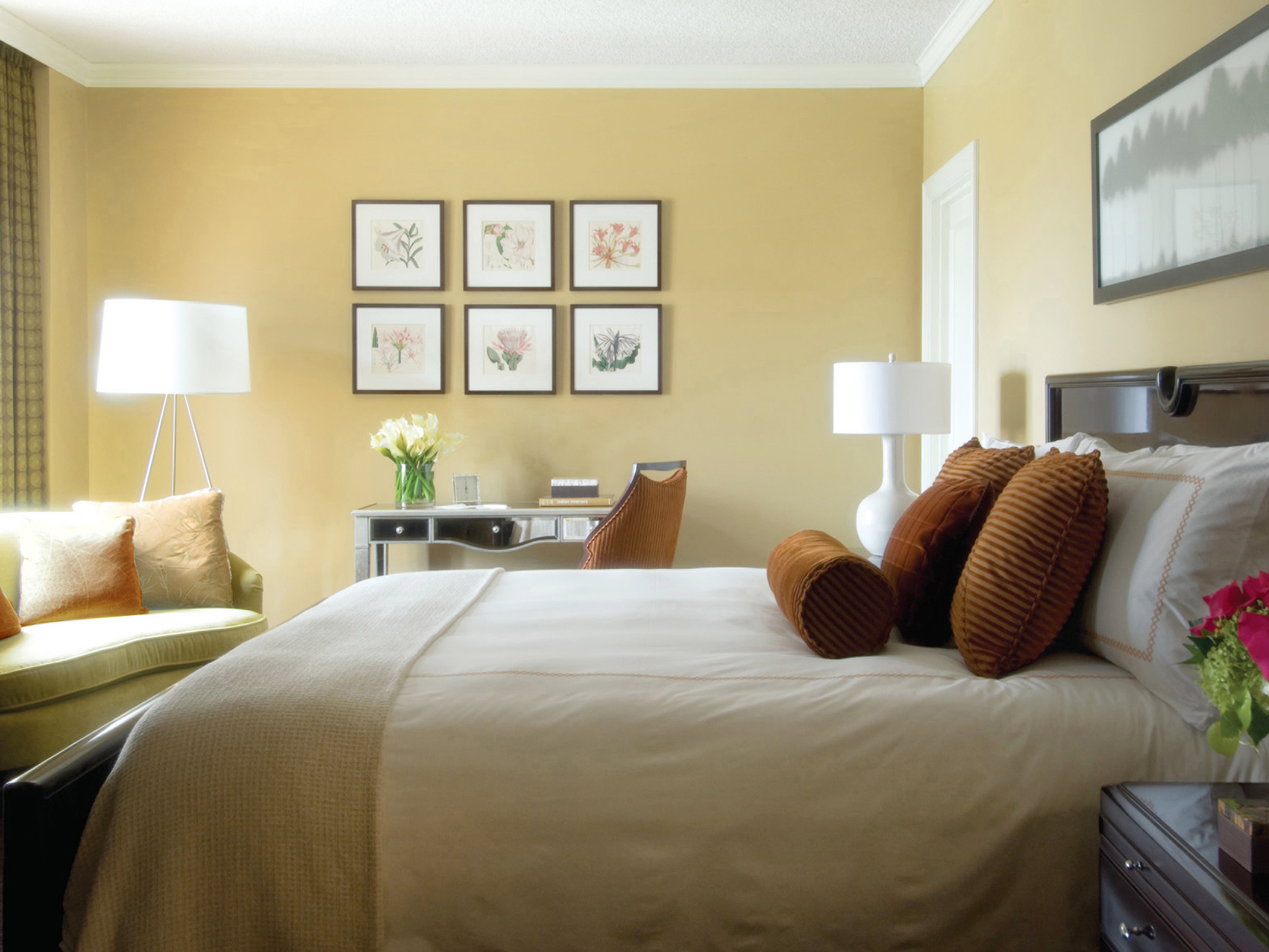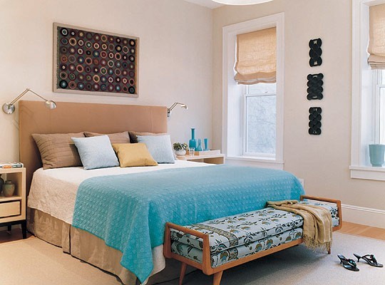 Empfohlene Pastellfarben, sowie natürliche Natur: blau, gelb, grün, braun. Sie werden leicht wahrgenommen und verursachen keine starken Emotionen. Günstige und weiße Farbe. Es ist neutral und symbolisiert Reinigung und Frieden. Helle und gesättigte Farben regen an und erlauben nicht, sich zu entspannen und Aufmerksamkeit zu erregen. Obwohl in einigen Fällen, zum Beispiel im Schlafzimmer der Jungvermählten, sind sie durchaus angemessen.