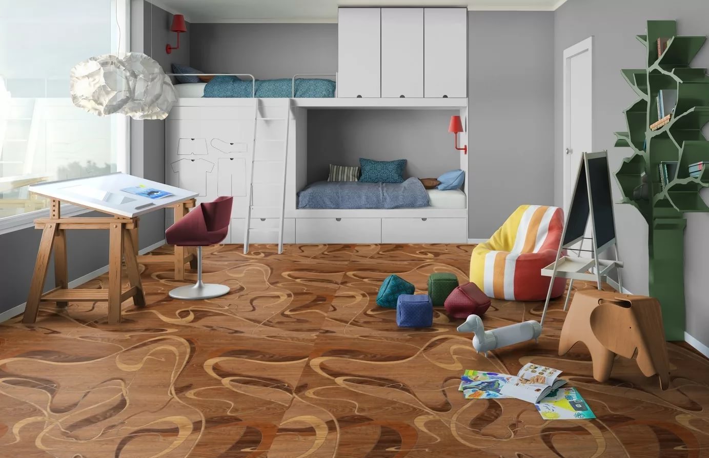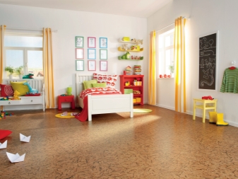 - Mit einem Muster unter dem Korken im Schlafzimmer des Kindes abdecken. Sie können keine Angst haben, dass Kinder diese Lackierung verfärben, es ist leicht zu waschen. Gleichzeitig sieht es ziemlich originell aus. Und wenn Sie das richtige Material auf der Basis von natürlichem Öl wählen, können Sie keine Angst vor dem Einfluss von Material auf die Gesundheit des Babys haben.