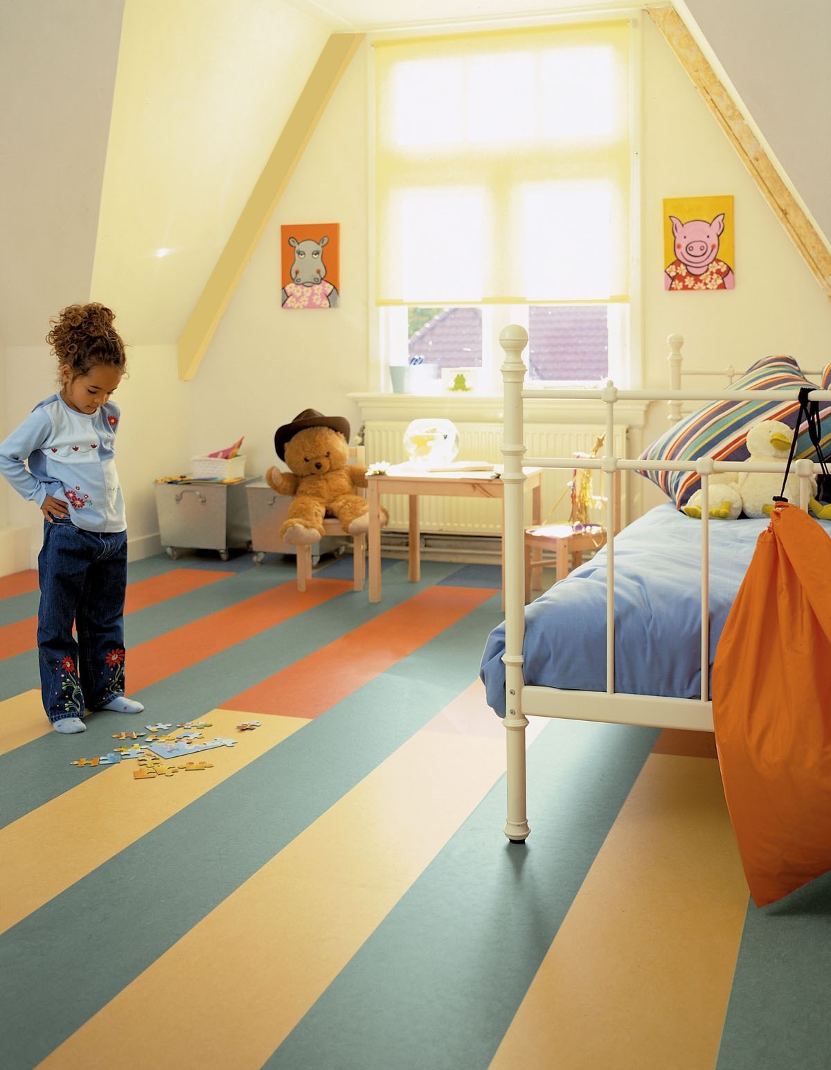 Linoleum ist ein polymerer Bodenbelag. Es wird in Rollen verkauft und bietet somit einen monolithischen Bodenbelag. Dies ist ein ziemlich ökonomisches Material.