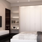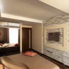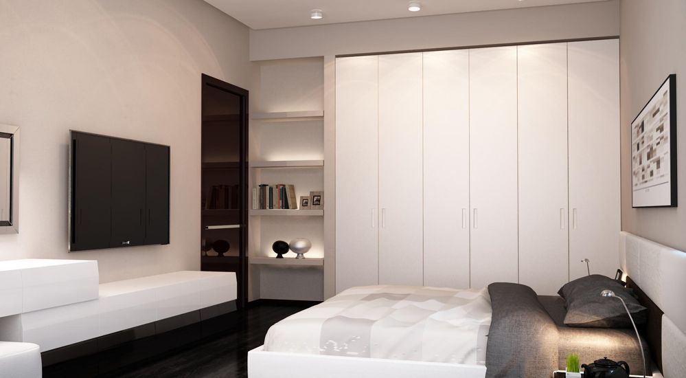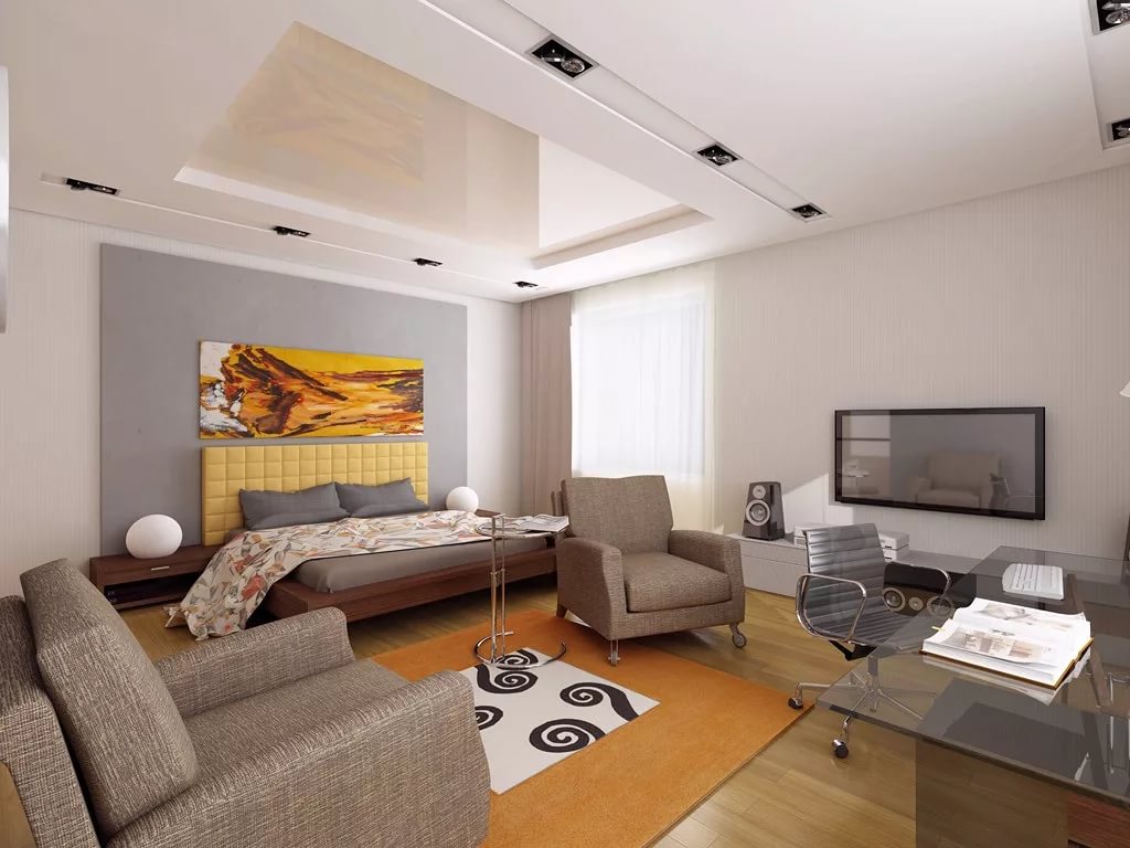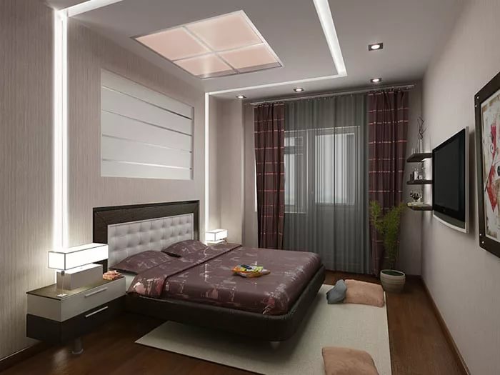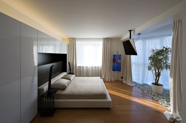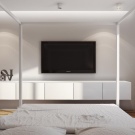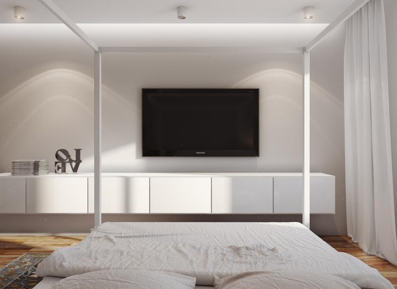 Erfahrene Experten sagen, dass der optimale Standort ein Punkt ist, der in einer geraden Linie von der Mitte des Bettes zur Wand gezogen wird, und die Höhe dieses Punktes wird später angepasst.Mit dieser Anordnung wird der Fernseher für alle Personen, die sich im Schlafzimmer befinden, deutlich sichtbar sein, und wenn Sie es sehen, wird es keine Unannehmlichkeiten geben.